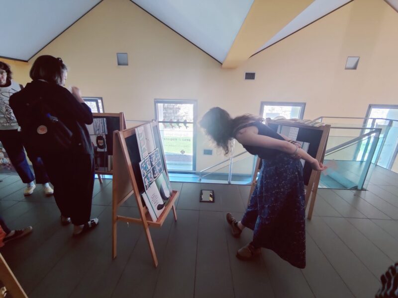 Alla fine della narrazione collettiva, davanti ai nostri piedi si è creata un’esposizione di libri in verticale con le pagine aperte verso gli altri, sollevando l’illustrazione a quadro come una sorta di pre galleria.
