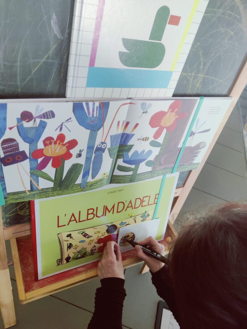 In balconata riallestiamo i libri aperti su lavagne per bambini, scombinando le coppie e creando una vera pinacoteca!