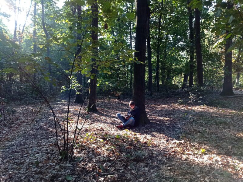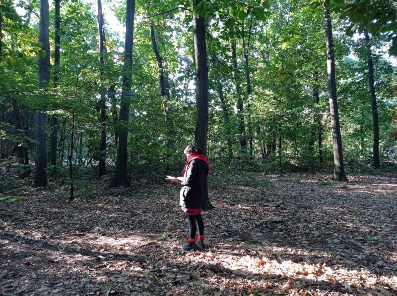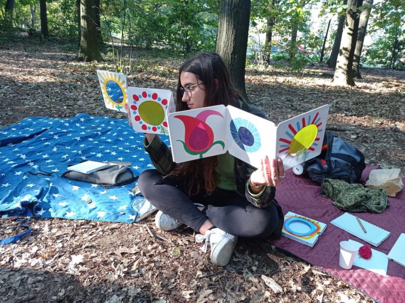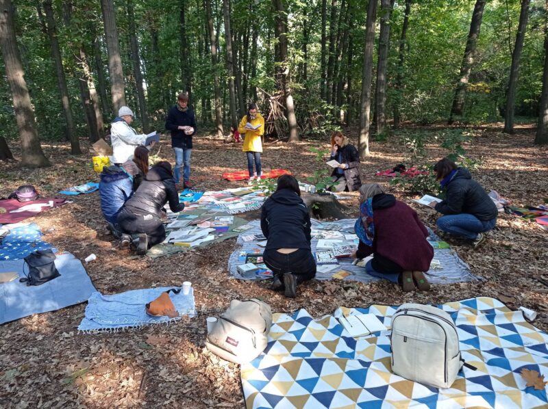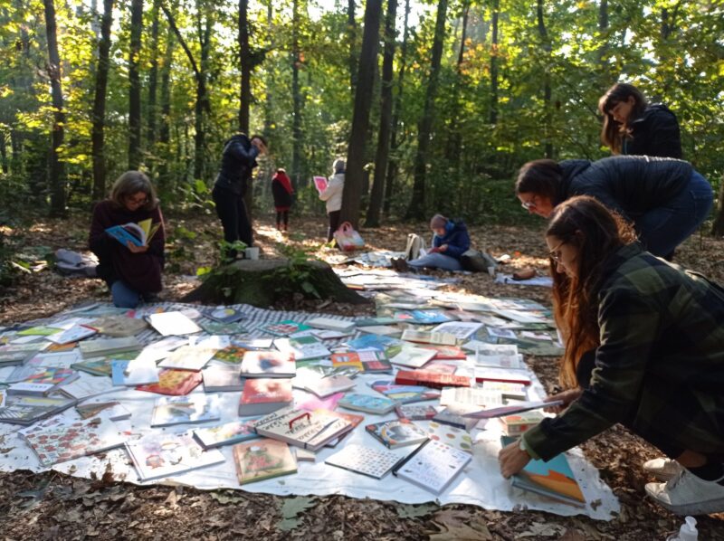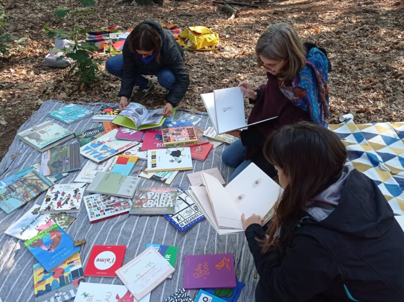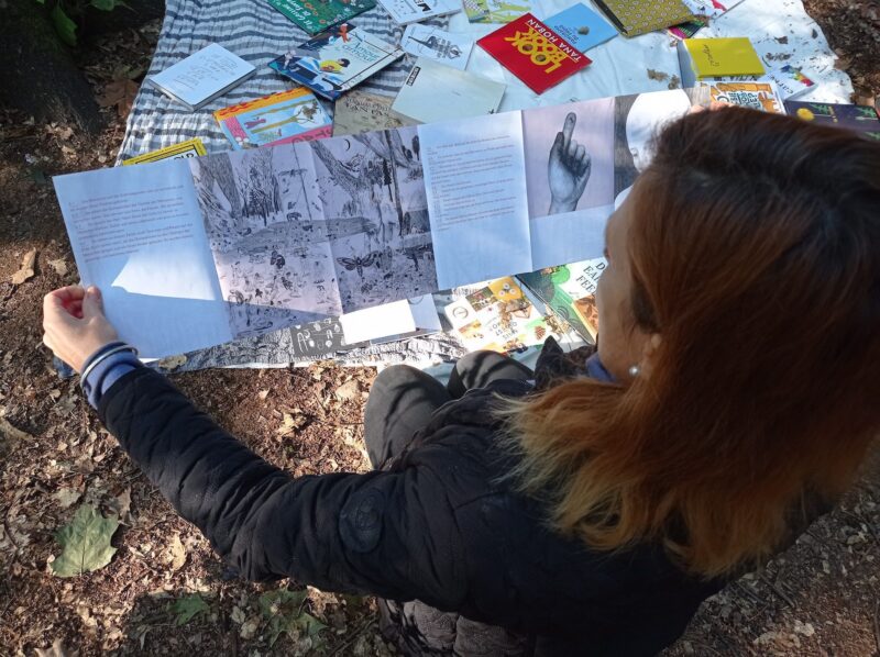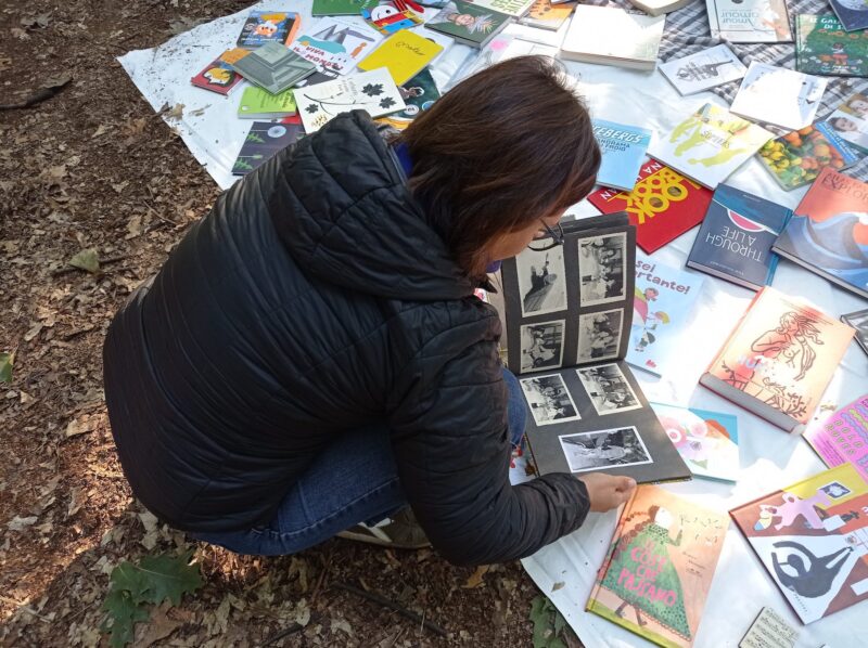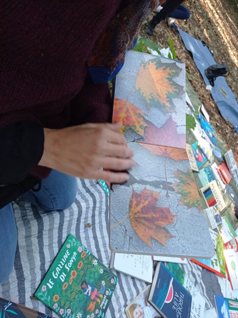 Domenica mattina di metà ottobre 2021, tra scoiattoli e pioggia di ghiande, abbiamo allestito nel bosco del Parco Alto Milanese una giungla di libri illustrati per bambini e adulti, diversi in tutti i sensi (stile, materiale, tecnica, formato, lingua, contenuto), sdraiati senza ordine su teli in mezzo a una radura.