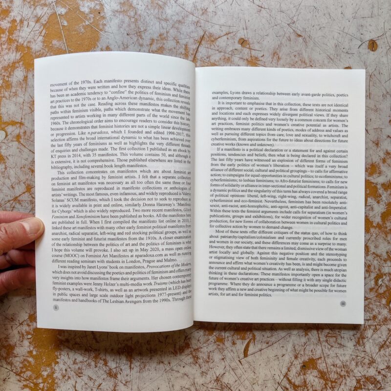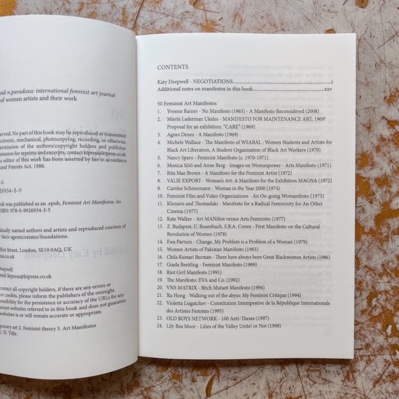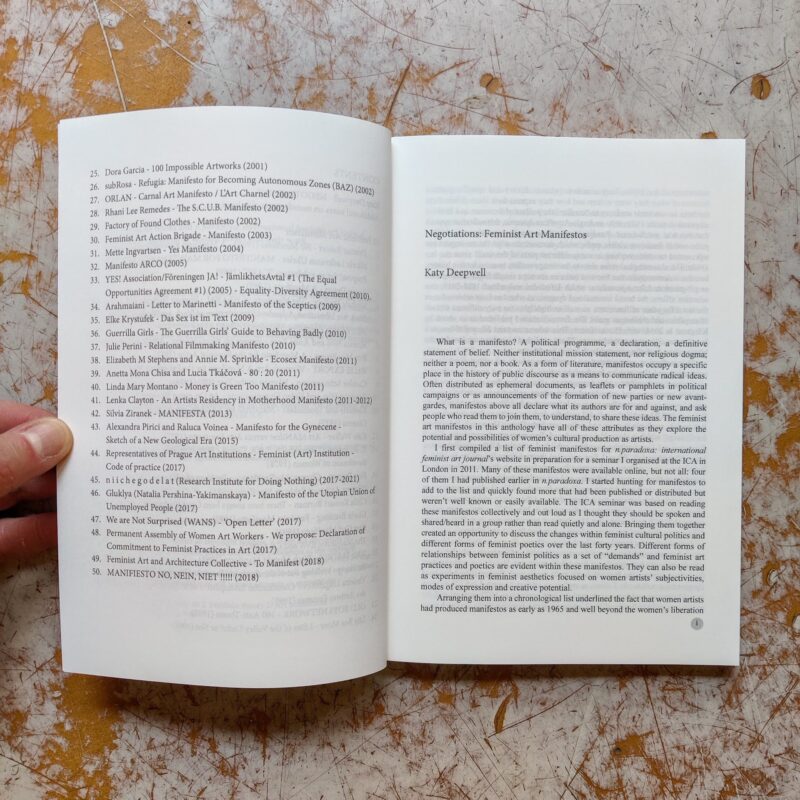 “This anthology contains the original manifestos of 50 women artists/feminist groups/feminist protests. Introductory essay by Katy Deepwell, with notes on each manifesto. What is a manifesto? A political programme, a declaration, a definitive statement of belief. Neither institutional mission statement, nor religious dogma; neither a poem, nor a book. As a form of literature, manifestos occupy a specific place in the history of public discourse as a means to communicate radical ideas. Distributed as often ephemeral documents, as leaflets or pamphlets in political campaigns or as announcements of the formation of new parties or new avant-gardes, manifestos above all declare what its authors are for and against, and ask people who read them to join them, to understand, to share these ideas. The feminist art manifestos in this anthology do all of these things as they explore the potential and possibilities of women’s cultural production as visual artists”(site web de l’éditeur).