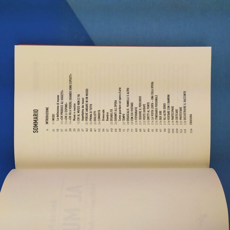“Che senso avrebbero i musei senza pubblico? A volte però, sembra che questi luoghi non siano pensati per accogliere: spesso ci sono troppe opere e troppi oggetti, non di rado le spiegazioni sono poche ed eccessivamente tecniche, gli orari sono oggettivamente scomodi; come se le esposizioni fossero progettate per professionisti che già conoscono quello che vanno a vedere, e non per persone curiose e disponibili ma con una formazione meno specialistica. Esagerato? Non troppo se nel corso di un anno solo tre italiani su dieci entrano in un museo, e di questi la maggior parte una volta sola. Eppure i musei sono un’immensa risorsa di scoperte e di emozioni, un patrimonio di racconti e curiosità da approfondire. Basta non avere soggezione del pregiudizio di un’istituzione noiosa e polverosa, essere consapevoli che la visita non è un compito da svolgere ma un’esperienza autonoma e libera dove è possibile scegliere cosa guardare e come farlo, dove la curiosità personale deve guidare il percorso. “Al museo” si propone come una sorta di guida per aiutare a superare le asperità piccole e grandi che si possono incontrare nella visita di un’esposizione museale, permanente o temporanea che sia. Sono suggerimenti spesso pratici, espressi in parte da altri visitatori e viaggiatori, stimoli e informazioni provenienti dalla letteratura scientifica o da episodi della cronaca, ma anche esperienze dirette. Il museo non è uno spazio neutro, ma l’espressione delle strutture politiche, sociali ed economiche che hanno accolto il pensiero dominante: è importante che i visitatori siano consapevoli del loro ruolo, che abbiano confidenza e sicurezza con questa istituzione per contribuire a renderla sempre più inclusiva, rispettosa e rappresentativa di tutte le componenti sociali”.
