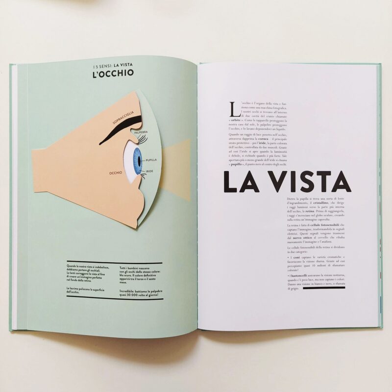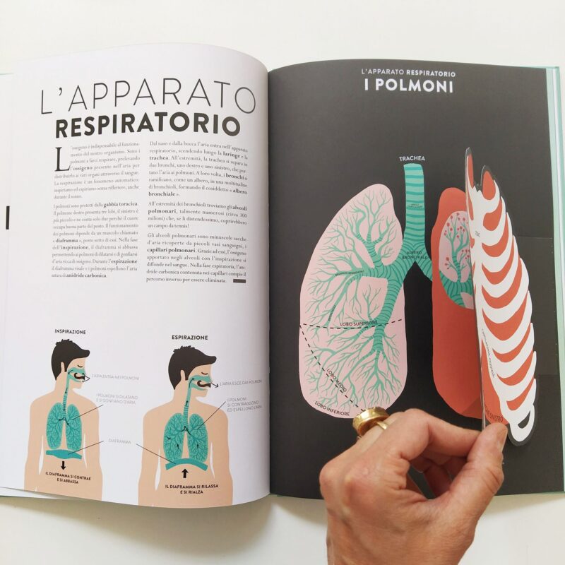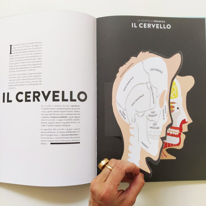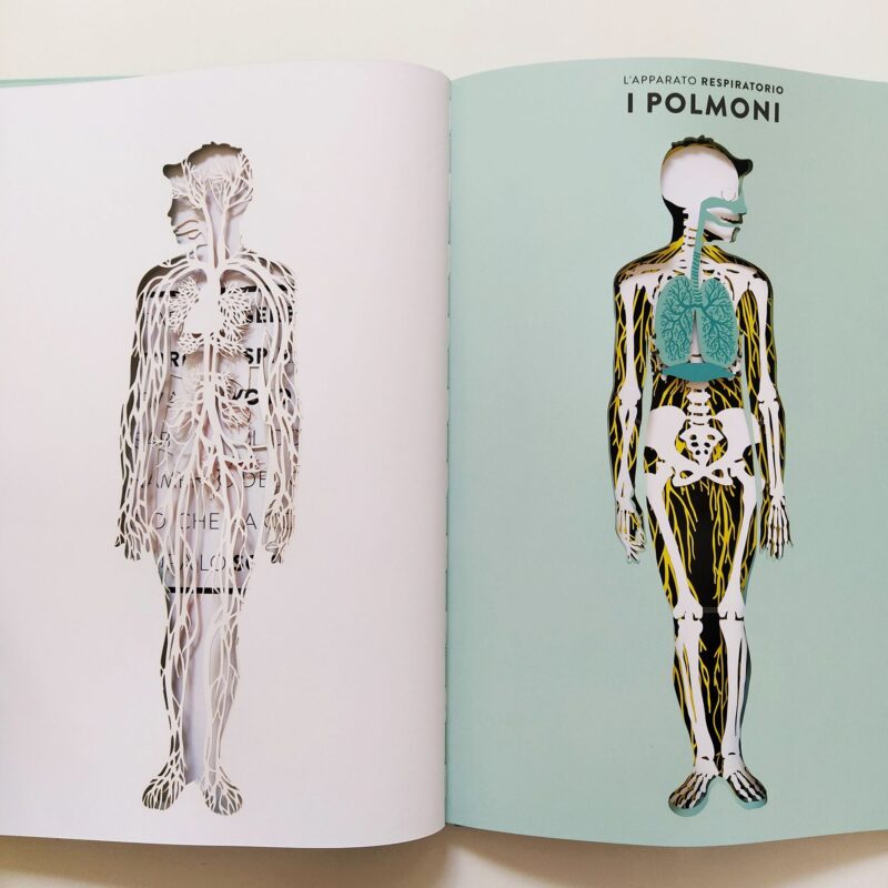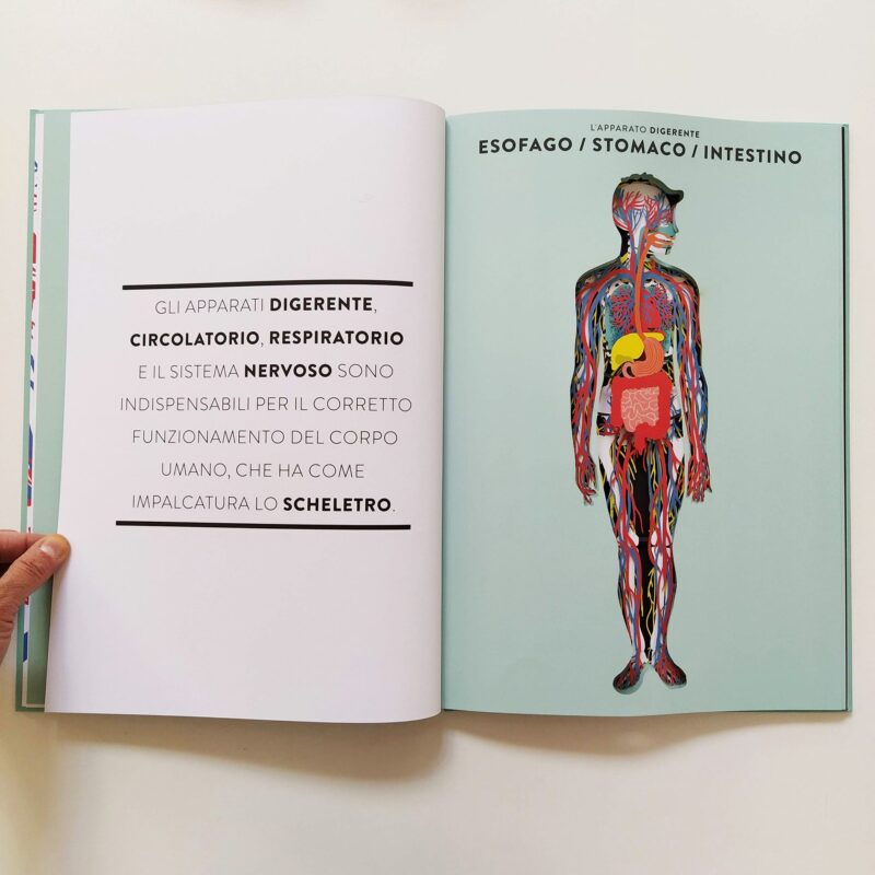 il corpo nei minimi dettagli. Hélène Druvert, illustratrice e designer della carta, concepisce le doppie pagine rifacendosi all'illustre tradizione delle tavole anatomiche del XIX secolo. I testi precisi e accessibili sono redatti dal padre dell'autrice, medico di professione, e accompagnano bambini e ragazzi alla comprensione del funzionamento del nostro corpo. Il testo include: i muscoli, il sistema nervoso, il cuore, il cervello, l'apparato digerente, circolatorio, respiratorio, urinario, lo scheletro, l'udito, l'odorato, il tatto, il gusto, la vista e il sistema riproduttivo femminile e maschile.