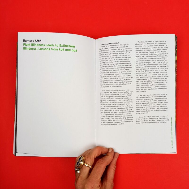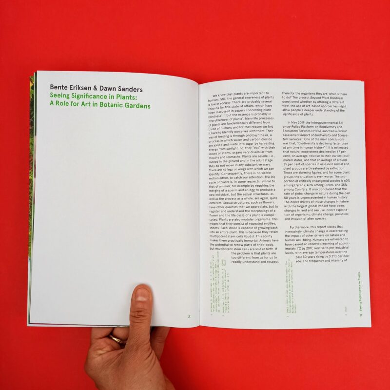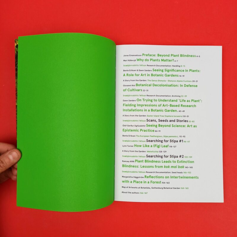 The book stems from the pedagogical, art and botanical project of the same name, undertaken between 2015 and 2018 by a core team of researchers – artists Bryndís Snæbjörnsdóttir & Mark Wilson, Dawn Sanders and Eva Nyberg (plant science educators) and Bente Eriksen (botanist). The team set out to urge a philosophical and actionable move beyond the cultural condition of ?plant blindness? and so to disrupt what is a traditional and debilitating human view. Despite the challenges, there is a need for humans to engage conceptually and responsibly with non-human organisms, possessing entirely different physiologies and behaviours. In our engagement with such difference, it is vital that we are not diverted into subjecting plants to human registers and ‘terms of resemblance’, (Houle, 2011) but rather to engage with their ‘plantness’ (Darley, 1990), an approach equating to ‘parities in meeting’ (Snæbjörnsdóttir & Wilson 2010).