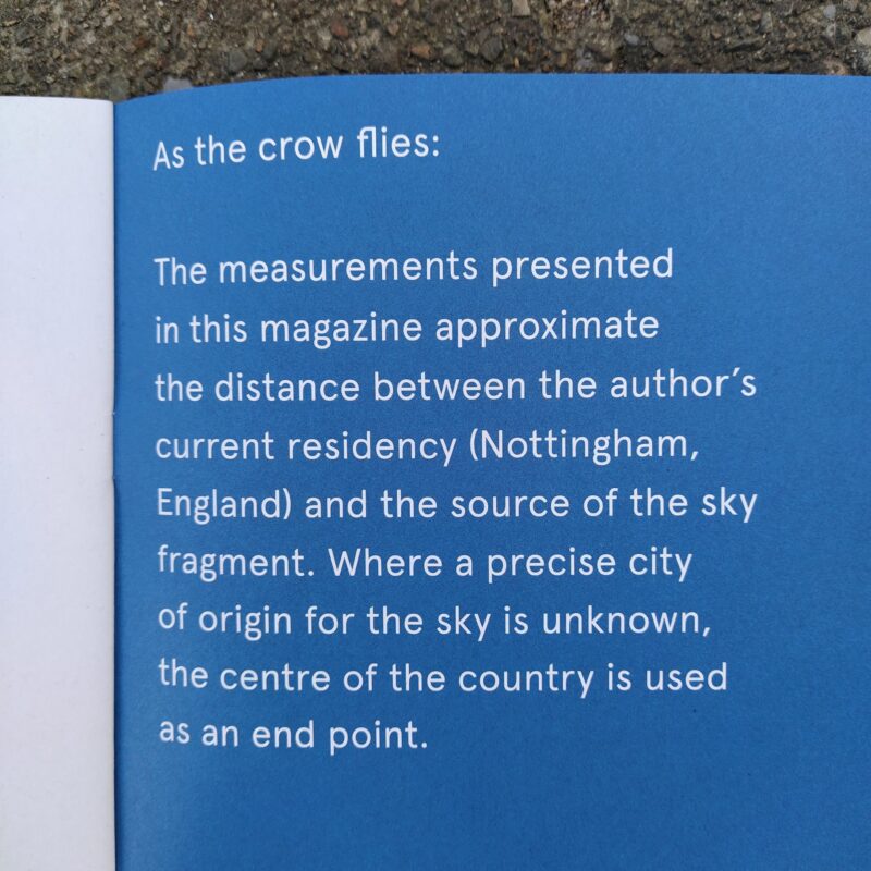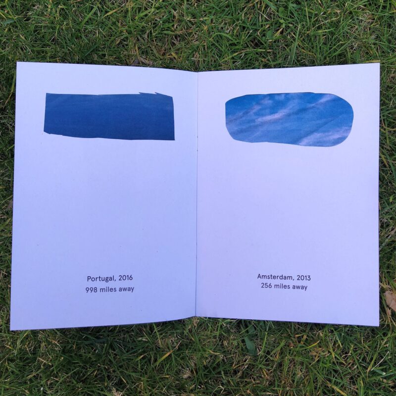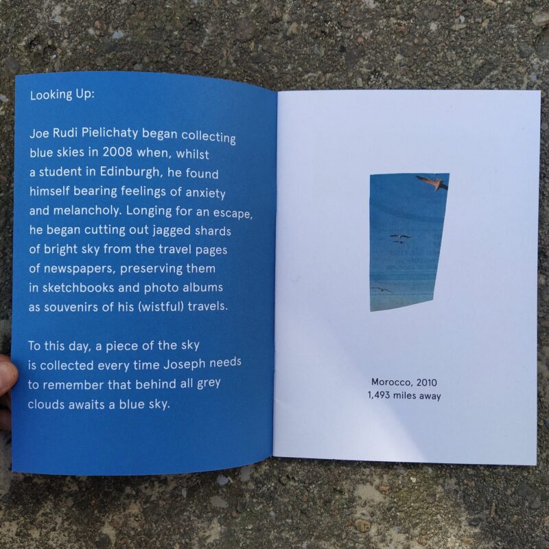 Joe Rudi Pielichaty iniziò a collezionare cieli blu nel 2008 quando, studente a Edimburgo, iniziò a provare ansia e malinconia. Preso dal desiderio di scappare, iniziò a raccogliere scampoli di cielo blu ritagliati da giornali e riviste di viaggio, conservandoli in quaderni e album fotografici come souvenir dei suoi (malinconici) viaggi. Ancora oggi, Joseph continua a ritagliare un pezzo di cielo ogni volta che deve ricordarsi che dietro le nuvole grigie c’è un cielo blu.