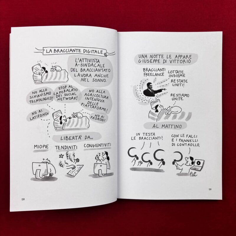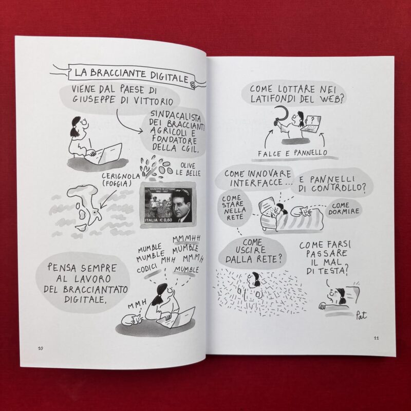 La bracciante digitale e le altre protagoniste di questo libro vivono tra le rovine del neoliberismo e del maschilismo. In poche battute raccontano il lavoro e la sua assenza, la guerra, l’ingiustizia sociale, sempre con l’intento di farci ridere e sorridere. Con leggerezza evocano e risvegliano la bracciante che è in noi, quella presenza antica che cova in chi non ha potere ma tiene acceso il desiderio di una libertà condivisa. Cinque capitoli scandiscono il percorso: Braccianti in lotta, Multitasking, Bombe e margherite, SOS Sanità, Bracciante del fumetto. Pagina dopo pagina, vignetta dopo vignetta, lottano contro i latifondisti del web e del pianeta, in cerca di un senso e di una terra in cui radicarsi. Braccianti di tutto il mondo, uniamoci!