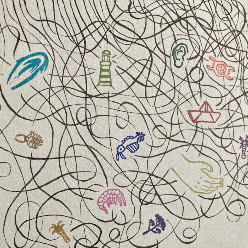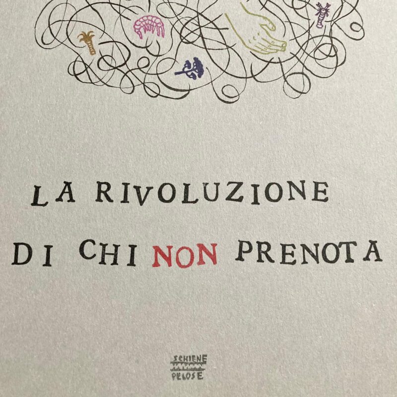 Poster formato A3 (29.7 x 42 cm) stampato a mano con timbri intagliati nelle gomme da cancellare, su carta Fabriano Clay 15% cotone. Disegnato a mano con brush-pen nero. Scritto con macchina Olivetti 82.