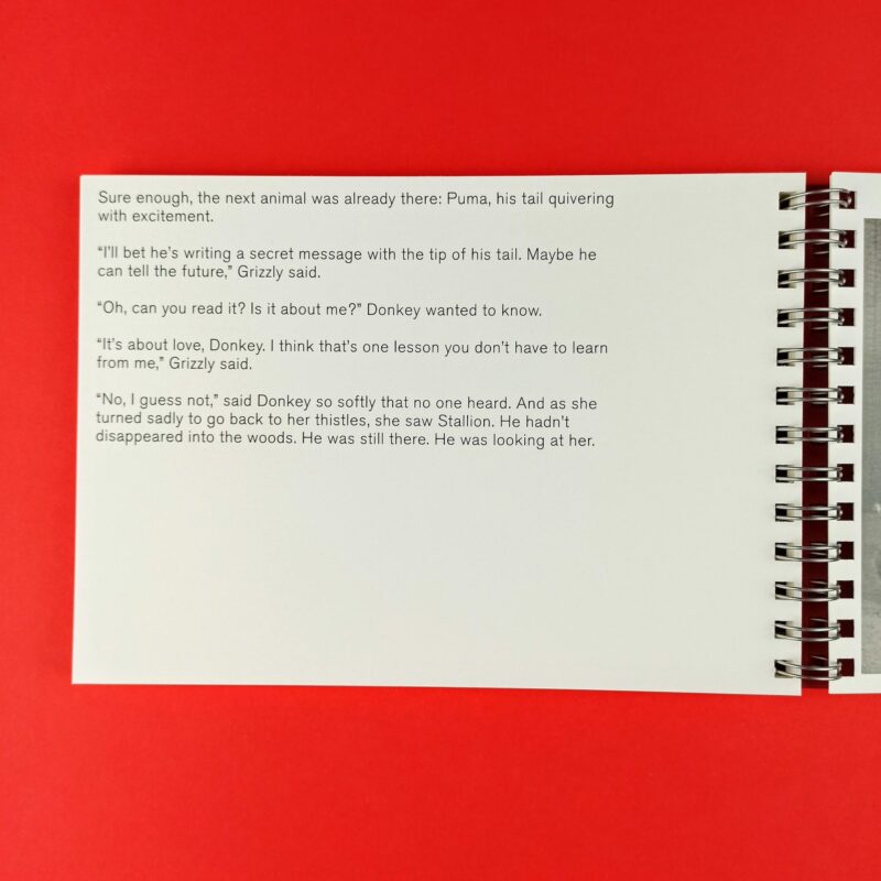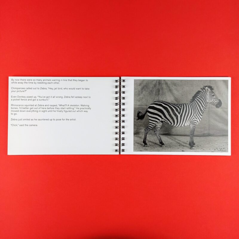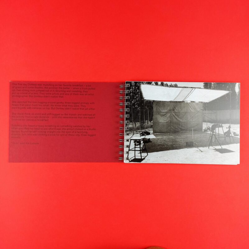In Balthasar Burkhard and Markus Jacob’s elegantly designed children’s book, 20 animals meet for a photographer’s beauty contest. The protagonist of the story is a shy donkey who watches the antics of the animals with wry humor as they pose for the photographer, parading their splendor. ”Please stand here, in front of this backdrop, Baboon, ‘ said the artist … ‘Click, ‘ said the camera.’