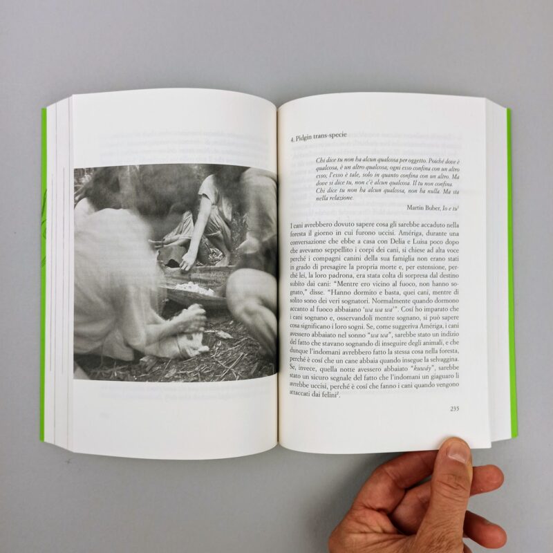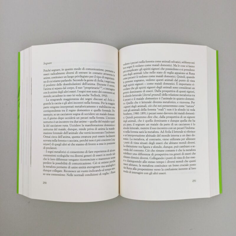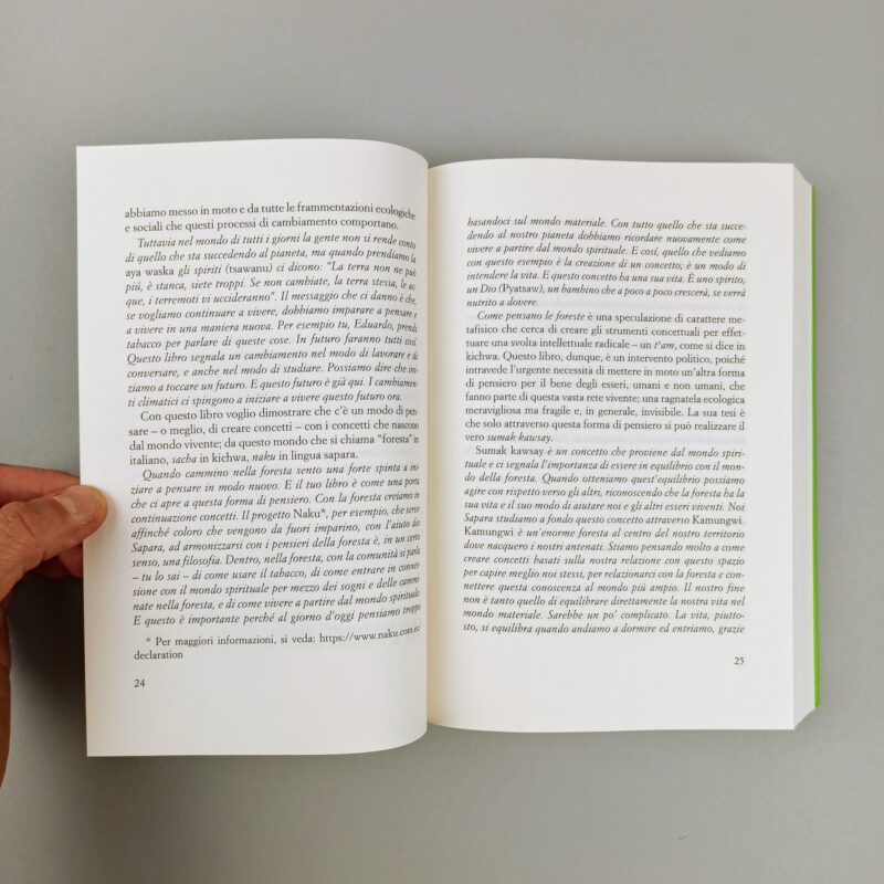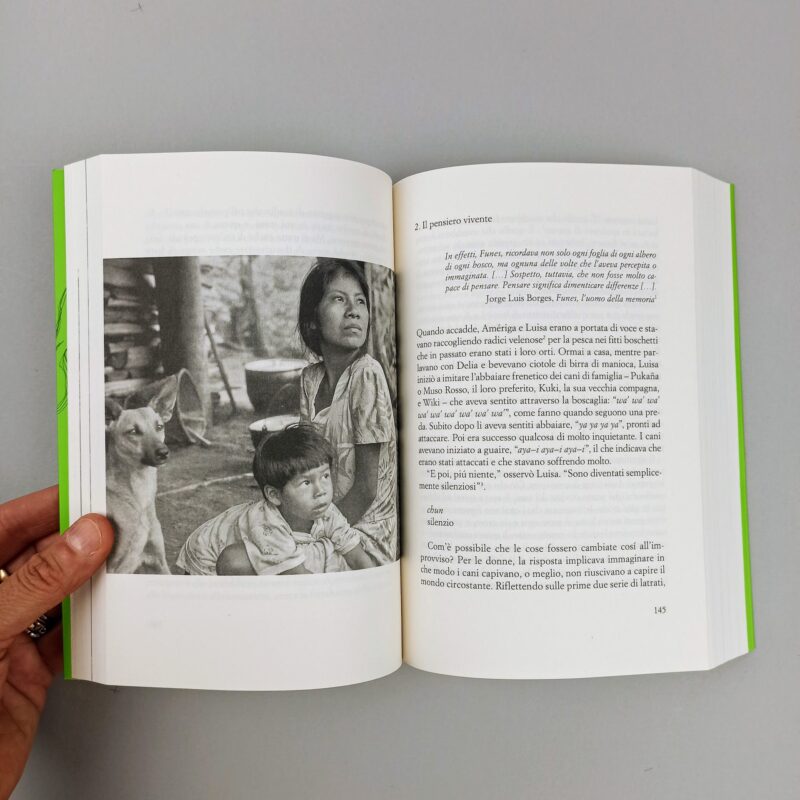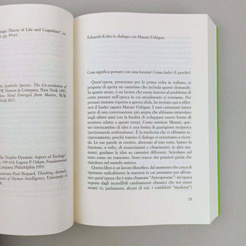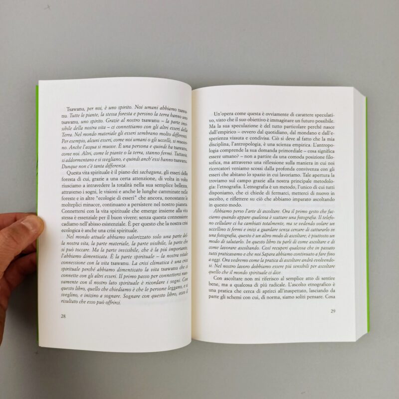 «Abbiamo perso l’arte di ascoltare. Ora il primo gesto che facciamo quando appare qualcosa è scattare una fotografia. (..) Se vedendo volare un uccellino ti fermi e inizia a guardare senza cercare di catturarlo in una fotografia, questo è un altro modo di ascoltare; è piuttosto un modo di salutarlo. In questo libro tu parli di come ascoltare e di come lavorare ascoltando. Così tu recuperi qualcosa di quello che tutti praticavano e che noi Sapara abbiamo continuato a fare fino a oggi. (..) Nel nostro lavoro dobbiamo essere più sensibili per ascoltare quello che il mondo spirituale ci dice.» Manari Ushigua in conversazione con Eduardo Kohn