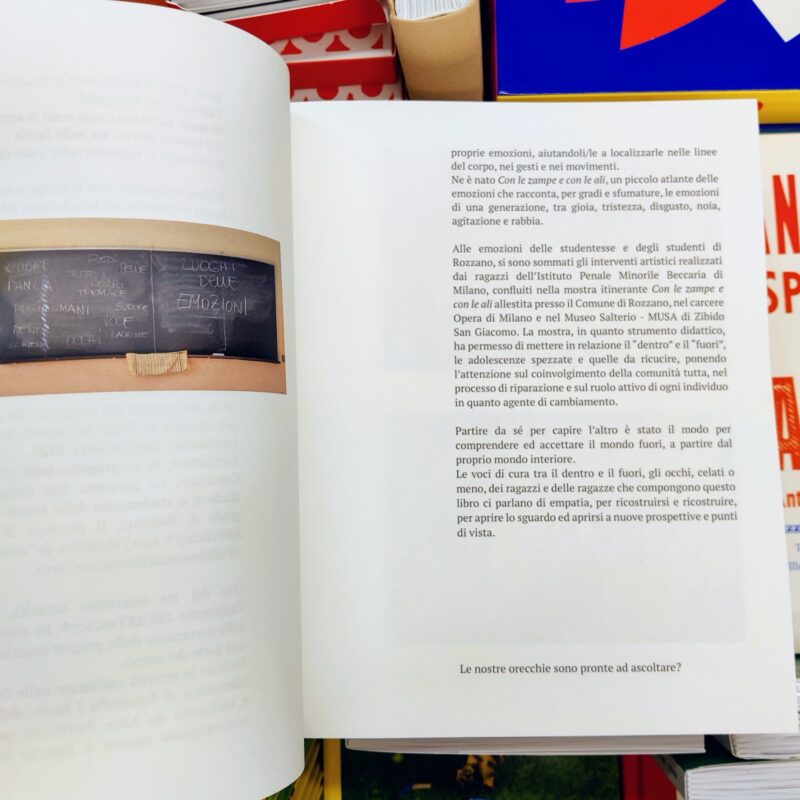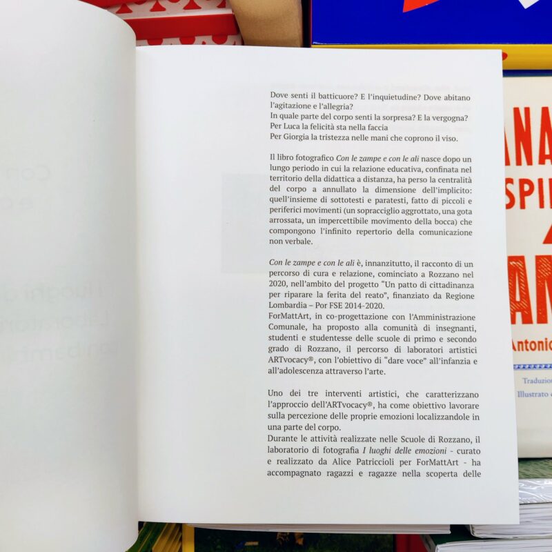 quale parte del corpo senti la sorpresa? E la vergogna? Per Luca la felicità sta nella faccia. Per Giorgia la tristezza nelle mani che coprono il viso. Il libro fotografico "Con le zampe e con le ali" nasce dopo un lungo periodo in cui la relazione educativa, confinata nel territorio della didattica a distanza, ha perso la centralità del corpo a annullato la dimensione dell'implicito, quell'insieme di sotto-testi e para--testi fatto di piccoli e periferici movimenti - sopracciglio aggrottato, una gota arrossata, un impercettibile movimento della bocca - che compongono l'infinito repertorio della comunicazione non verbale.