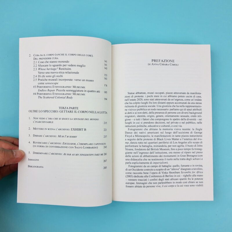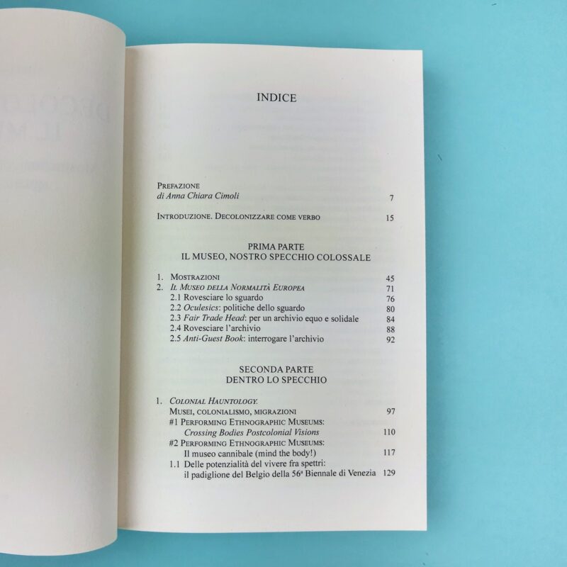 Il museo è lo specchio colossale in cui l’Europa si è costruita e rappresentata, anche attraverso il riflesso dell’immagine di altre culture: culture esposte mentre se ne costruiva, parallelamente, l’invisibilizzazione. Museo, nazionalismo e colonialismo parlano la stessa lingua. Oggi il colonialismo cambia forme e modalità di espressione, ma la sua potenza non si è ancora esaurita. Sopravvive anche nei musei contemporanei, in particolare nei musei etnografici, e in tanti altri ambiti del vivere sociale, perché oltre la messa a fuoco museale che questo libro propone, la questione riguarda tutto quello che c’è intorno, a perdita d’occhio. Una colonialità eclatante e millimetrica, pubblica e domestica, che abbiamo interiorizzato nel nostro ordinario, e che abbiamo la necessità di comprendere e trasgredire in tutti i luoghi in cui si esprime. Il museo può diventare un luogo cruciale: a partire da un’analisi riflessiva e critica delle sue radici coloniali, può trasformarsi in un vero e proprio laboratorio di pratiche di decolonizzazione. Il libro propone alcune tracce possibili di questo processo, attraverso la rimediazione delle arti contemporanee.