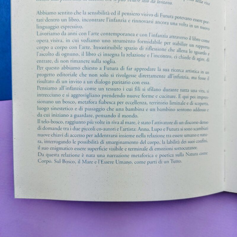 Un fotolibro nato da un’opera d’arte pubblica, generato dal dialogo tra una bambina, un bambino e un’artista. Una narrazione metaforica e poetica sulla Natura come Corpo. Sul Bosco, il Mare e l’Essere Umano, come parti di un Tutto vivente. La fotografia, la grafica e la scrittura compongono un racconto visivo e circolare, cadenzato di domande sulla comune misteriosa verità del corpo. I due protagonisti ci restituiscono l’esperienza della scoperta e della conoscenza che si costruiscono con il sentire. Anna e Lupo si scambiano dubbi, saperi e non saperi. Nutrendosi di curiosità si orientano in un pensiero riflessivo profondo: Io guardo il bosco o sono nel bosco? E il bosco mi può guardare? Perché non posso vedere una cosa forte come il vento? …Non so come è fatto dentro il mio corpo. “E’ un corpo la terra?” È un incontro con l’infanzia della Terra e di ognuno di noi. Età di lettura: da 5 anni.
