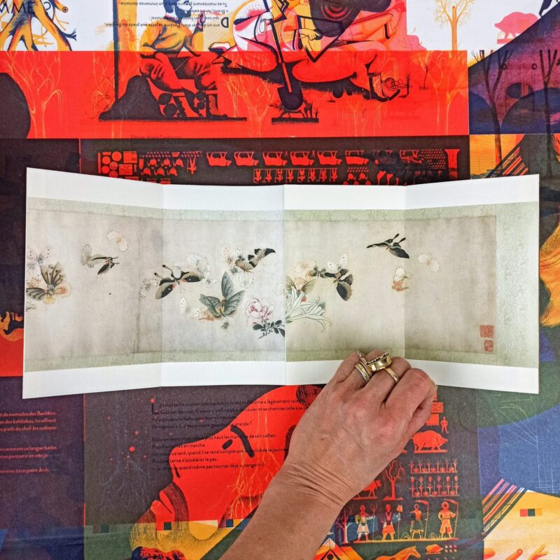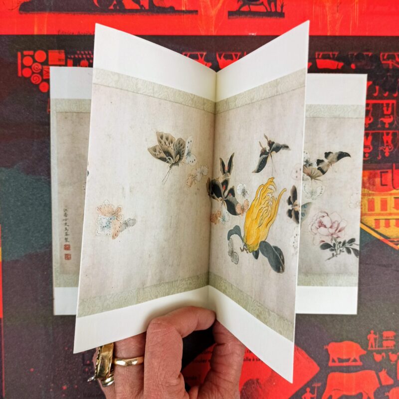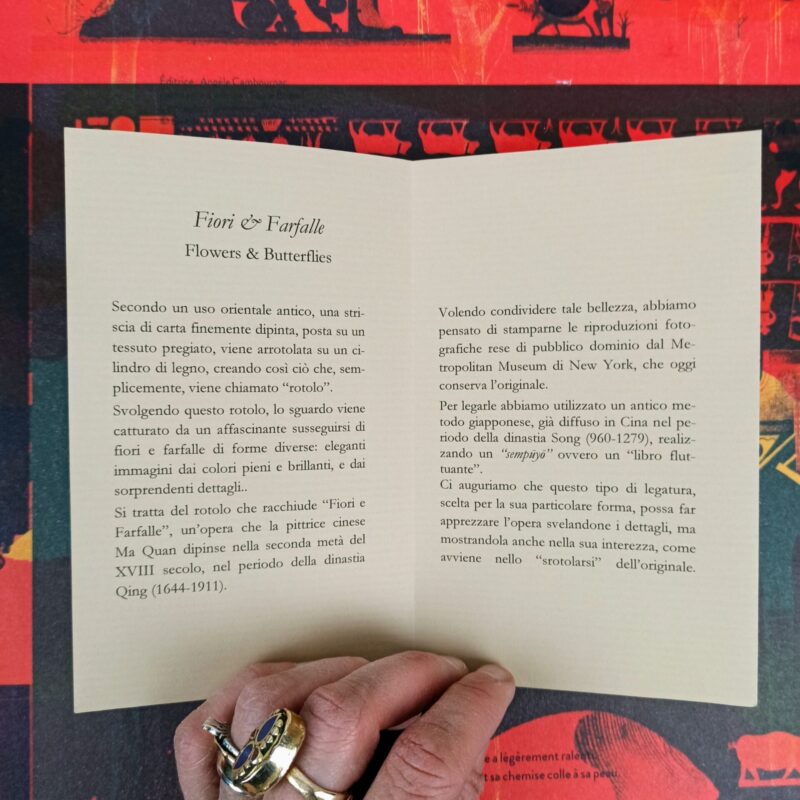Realistici e fantastici al tempo stesso, i fiori e le farfalle della pittrice cinese Ma Quan ci sorprendono per i colori forti e tenui e per la ricchezza dei dettagli.Si tratta di un dipinto su rotolo risalente alla metà del XVIII secolo che Levania ha riprodotto e legato a mano secondo un antico metodo giapponese, già diffuso in Cina nel periodo della dinastia Song (960-1279): è un “semp?y?” ovvero un “libro fluttuante”. Tale legatura permette non solo di apprezzare l’opera svelandone i minuti dettagli, ma la mostra anche nella sua interezza, come avviene nello “srotolarsi” dell’originale.