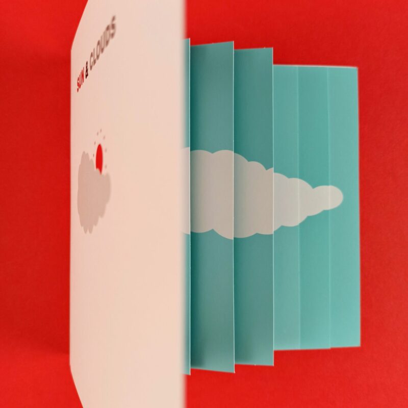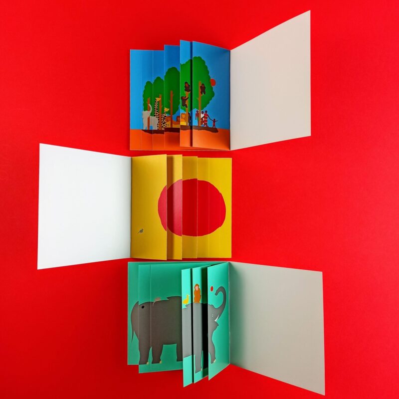 cofanetto 12 x 12 cm contenente 4 libretti con pagine tagliate di misure differenti per creare animazioni visive
