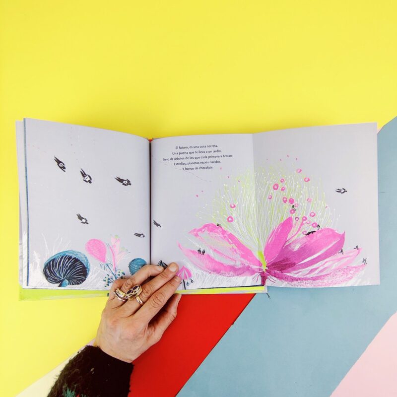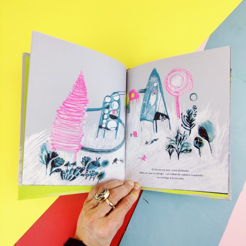 El futuro es una cosa plateada. Días en que tu amigo ?un robot de cabeza cuadrada? va a la escuela contigo. El futuro es algo secreto. Una puerta que conduce a un jardín, lleno de árboles de los que brota cada primavera: estrellas, planetas recién nacidos y barras de chocolate.
