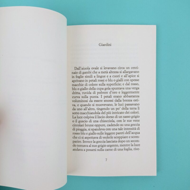 Pubblicato per la prima volta nel 1921, il racconto “Giardini” riproduce come in un dipinto impressionista un seducente gioco di colori: macchie di luce e d’ombra, profondi laghi verdi, ampie distese di fiori gialli, rossi e blu fanno risplendere con le loro sfumature i meravigliosi giardini di Kew Gardens, a Londra, in un assolato giorno di luglio. Tra le aiuole e gli alberi «appiattiti come lame ondeggianti» un uomo passeggia rievocando un momento perduto del proprio passato, mentre intorno a lui altre figure – donne, anziani, bambini – si muovono in un brulichio di vita e ricordi. Questo volume contiene anche: “Nel frutteto”, “Lettera a un giovane poeta”, “Morte di una falena”, nonché il celebre messaggio di addio di Virginia Woolf al marito.