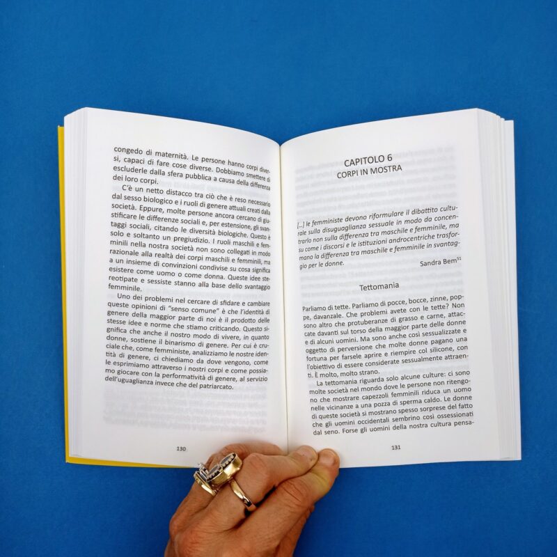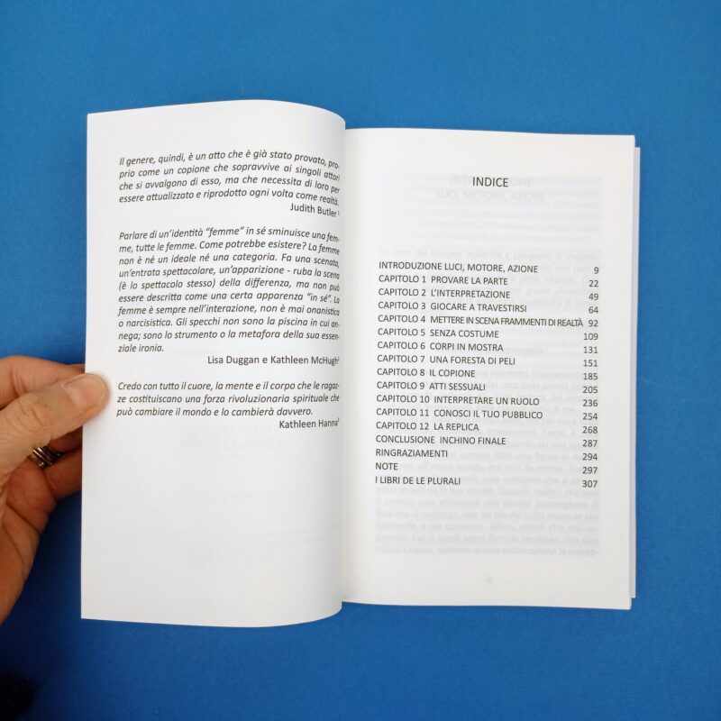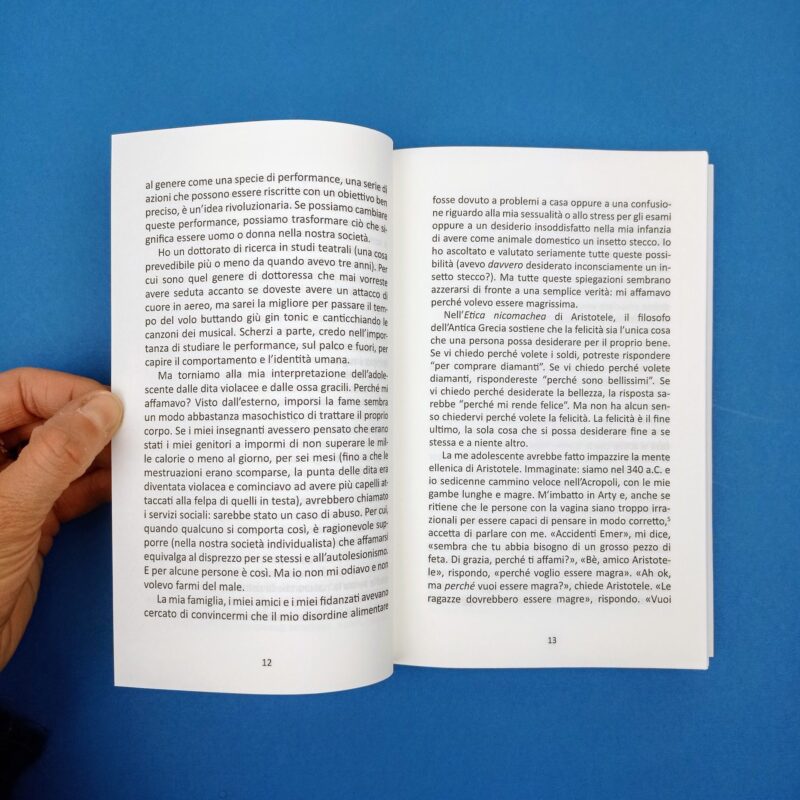 “Questo libro parla di come interpretiamo il genere. E parla per lo più del corpo, perché i nostri corpi vengono usati per definirci e inserirci nella società. Ho cominciato con l’immagine del mio corpo che cade, perché anche quella è in qualche modo una performance. (..) É una performance che ci dimostra che abbiamo bisogno di un nuovo copione. Anche se tanti, così come il mio vicepreside di allora, riconoscono questa esigenza, nessuno sembra sapere come sono state scritte queste battute in principio, figuriamoci come cominciare a scriverne di nuove. Così il problema viene ignorato”.