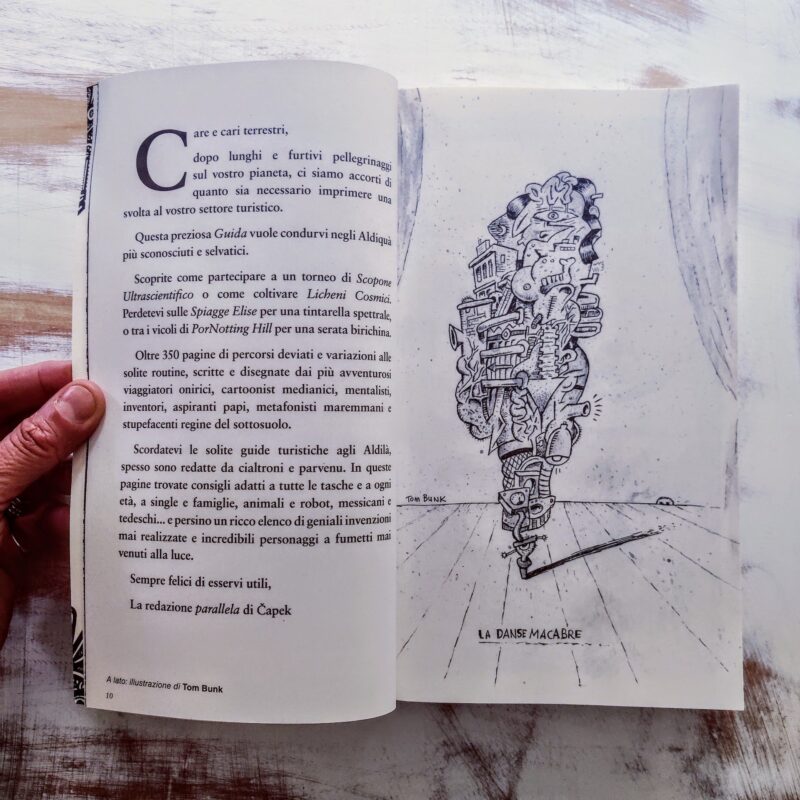 Bisogna “imprimere una svolta al settore turistico”! Dopo la “Guida turistica agli aldilà possibili” ecco quella per gli “aldiquà selvatici” a cura della redazione di Capek: quasi 400 pagine con più di 120 autori di parole e immagini in bianco e nero per esplorare altri mondi magici, misteriosi, surreali, sexy, “non sogni ma solide surrealtà”.