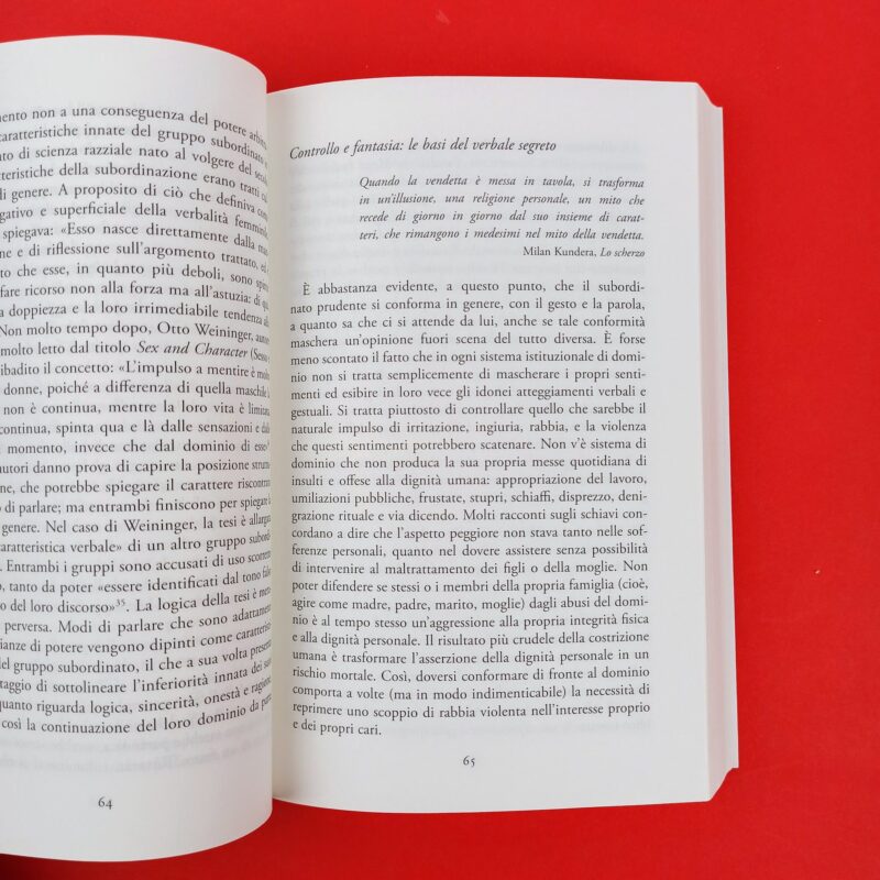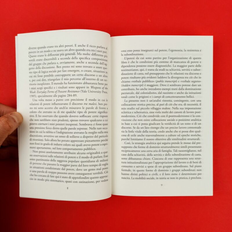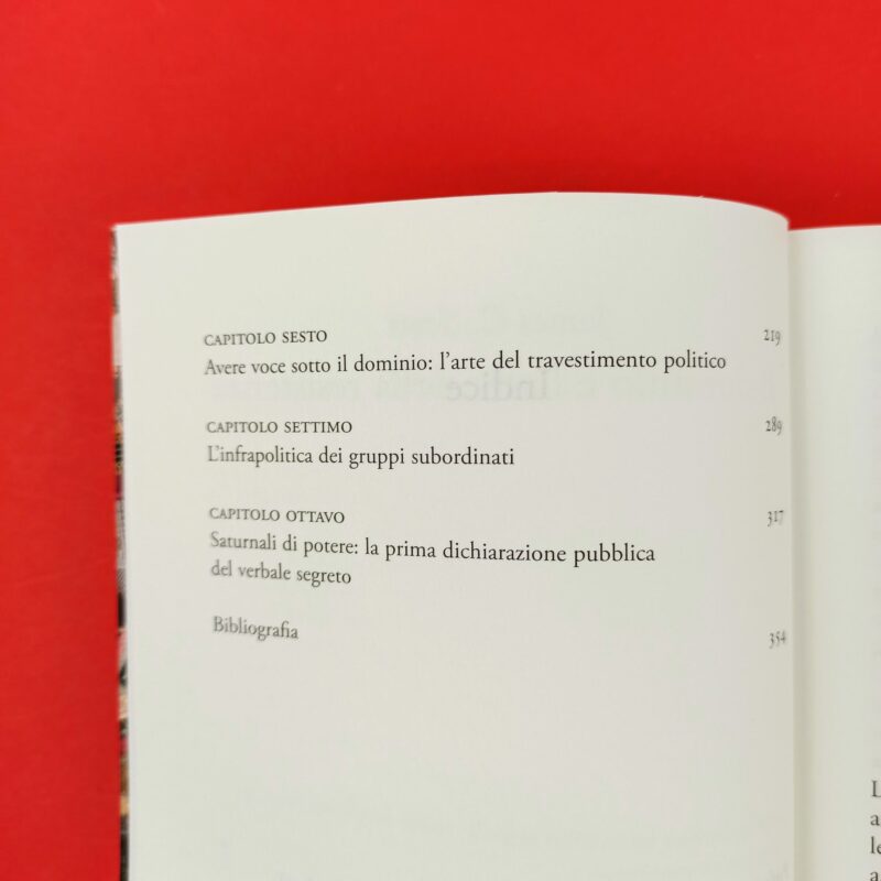 «Quando passa il gran signore, il saggio villico fa un profondo inchino e silenziosamente scoreggia». Questo proverbio etiope, citato in apertura del libro, dà una prima beffarda idea di cosa Scott intenda per quei «verbali segreti» che legge dietro i comportamenti codificati tra dominanti e dominati. Al di là delle apparenze, queste relazioni sono conflittuali e intrise d’inganno: da una parte i subordinati simulano la propria deferenza al potere e dall’altra i detentori del potere «recitano» la propria supremazia. Utilizzando innumerevoli esempi tratti, nel tempo e nello spazio, dalla letteratura, dalla storia e dall’etnologia, Scott propone un’inedita analisi sia dei ruoli interpretati sulla scena pubblica da potenti e subalterni, sia del loro «discorso» dietro le quinte, reciprocamente irridente e astioso. Uno studio sull’infrapolitica dei «senza potere», ovvero sulle strategie di insubordinazione messe in atto al di fuori dell’ambito politico, che rimane una pietra miliare per la comprensione della subordinazione, della resistenza, dell’egemonia, della cultura popolare e della rivolta.