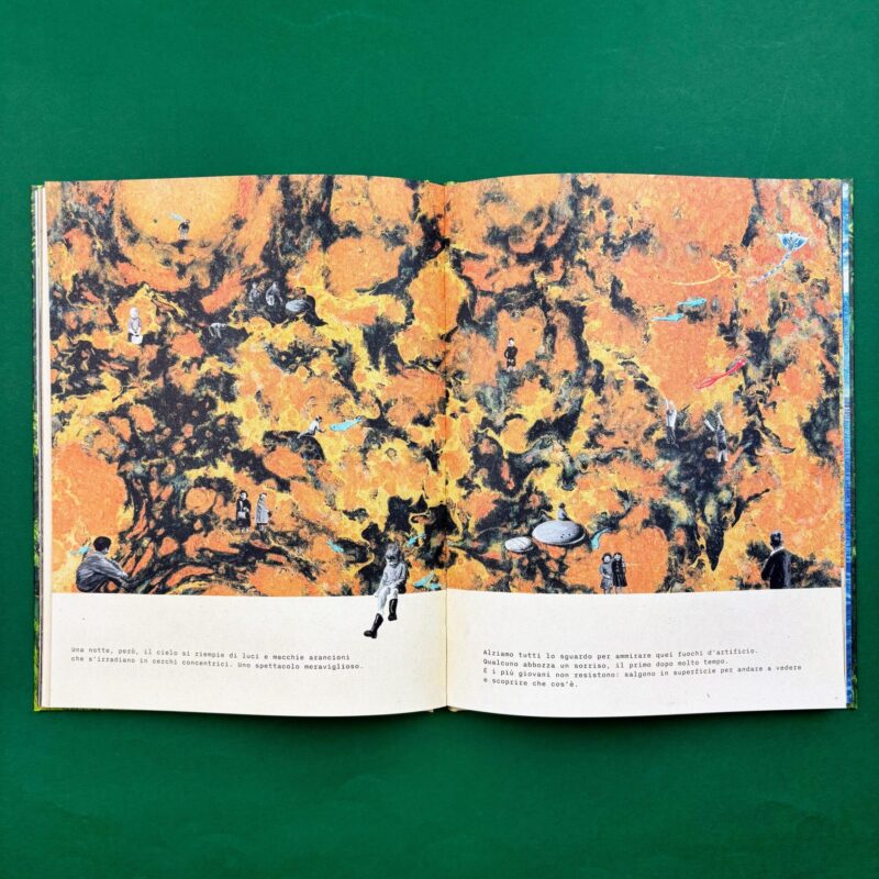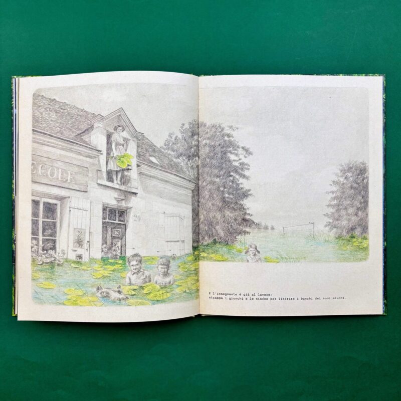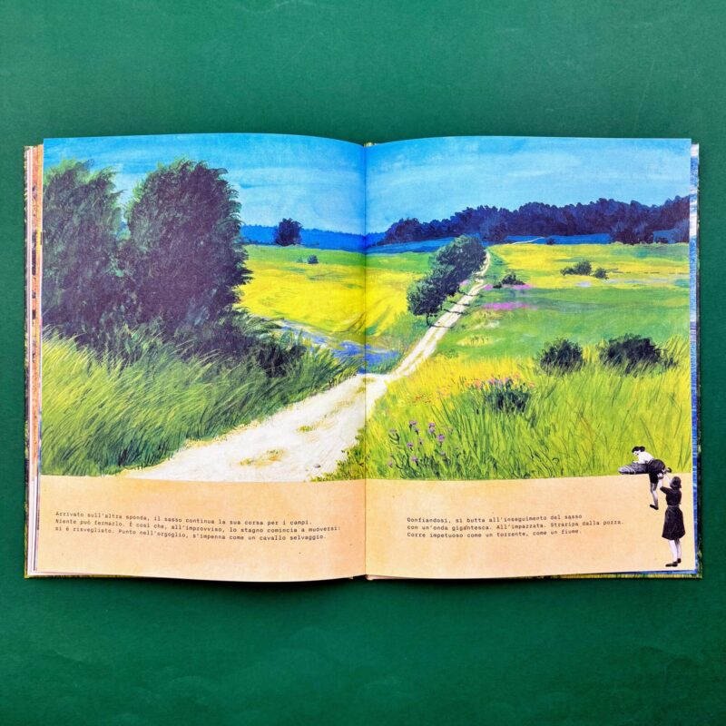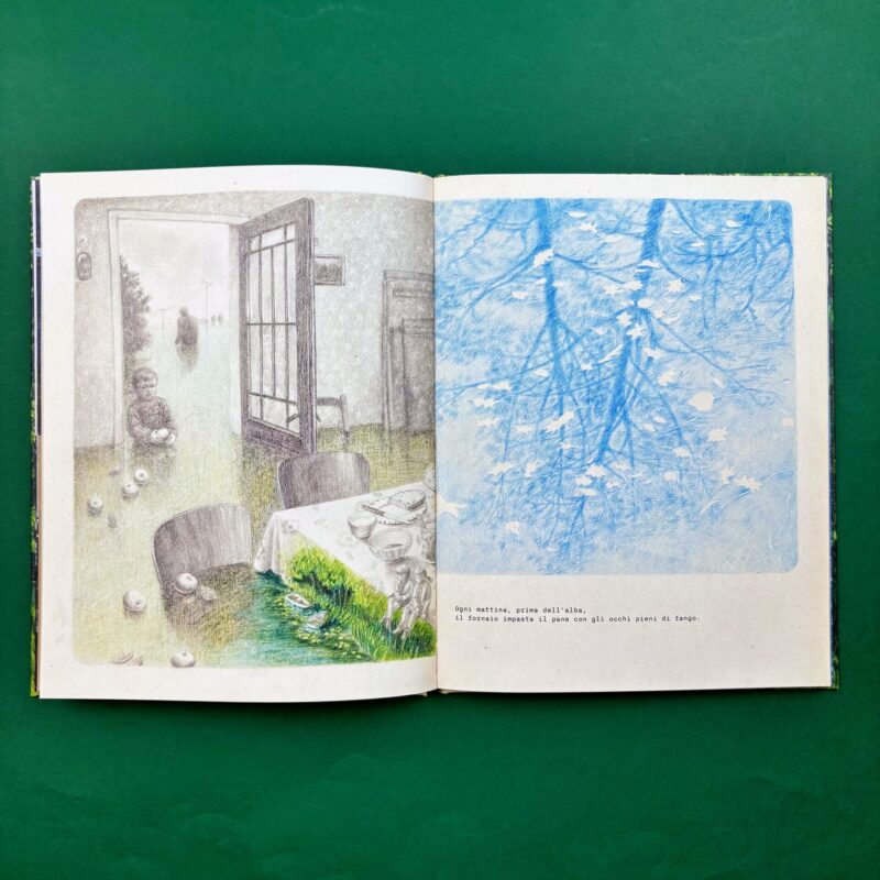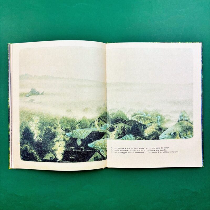 Il mondo è immobile, non c’è acqua che scorre, tutto è palude. Così ci si abitua a vivere sott’acqua, come le carpe, in silenzio, con lo sguardo rivolto verso il basso. Quando arriva uno straniero a lanciare sassi, l’acqua inizia a muoversi e i bambini sono i primi a seguirlo. Il cambiamento ha inizio, tutto torna a muoversi. Anche le illustrazioni di Joanna Concejo cambiano registro e abbracciano il surrealismo.