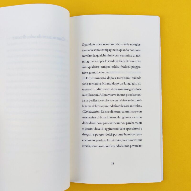 Questo piccolo e intenso libro raccoglie due scritti di Antonio Moresco sul cammino e contiene tante esperienze estreme e tanti anni di vita: il primo racconta i cammini metropolitani e solitari compiuti notte dopo notte durante l’arco di diversi decenni; il secondo è una riflessione più generale sul gesto di sconfinamento e parla dei cammini – anche di migliaia di chilometri attraverso l’Italia e l’Europa – compiuti da un gruppo di sconfinatori che si sono dati il nome di Repubblica nomade. Sono due modi opposti di camminare: il primo interiore, autistico, simile a una trance; il secondo vissuto come una trascendenza collettiva, un’impresa, una prova. Il primo è la testimonianza di un lungo dolore fronteggiato attraverso l’oltranza del cammino. Il secondo è una riflessione sulla potenza metamorfica del cammino. Per Antonio Moresco, non c’è opposizione tra i due modi di camminare: “nel camminatore collettivo c’è dentro il camminatore solitario, così come nel camminatore solitario c’è dentro il camminatore collettivo. Come se, anche quando cammino con altri, permanesse dentro di me una presenza nucleare irriducibile, inviolabile, irraggiungibile, e mentre cammino da solo camminassero dentro di me e attraverso di me tutti gli individui della mia e della nostra stirpe e persino i popoli che si sono forgiati attraverso migrazioni, esodi, diaspore.”