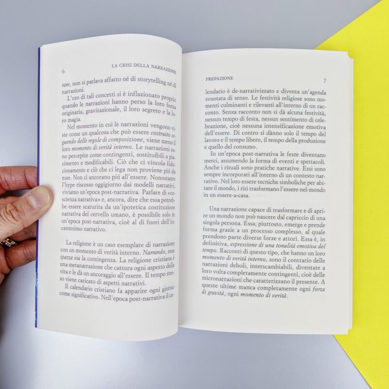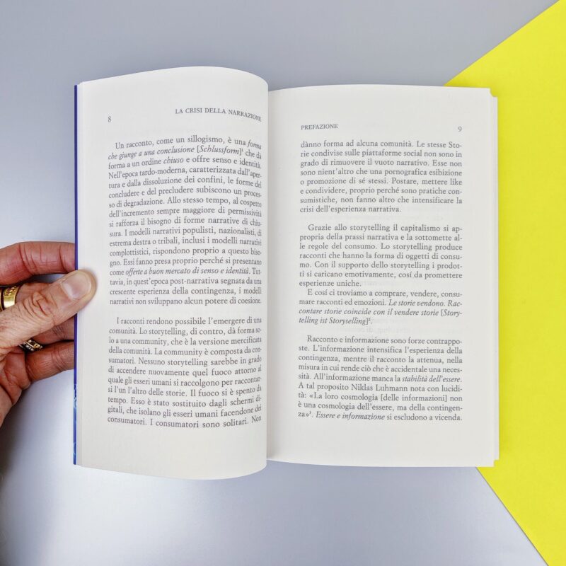 Viviamo in un’epoca post-narrativa dove “grazie allo storytelling, il capitalismo si appropria della prassi narrativa e la sottomette alle regole del consumo”. Raccontare storie coincide con il vendere storie che significa vendere emozioni mentre “La comunità narrativa è una comunità i cui partecipanti restano in ascolto”.