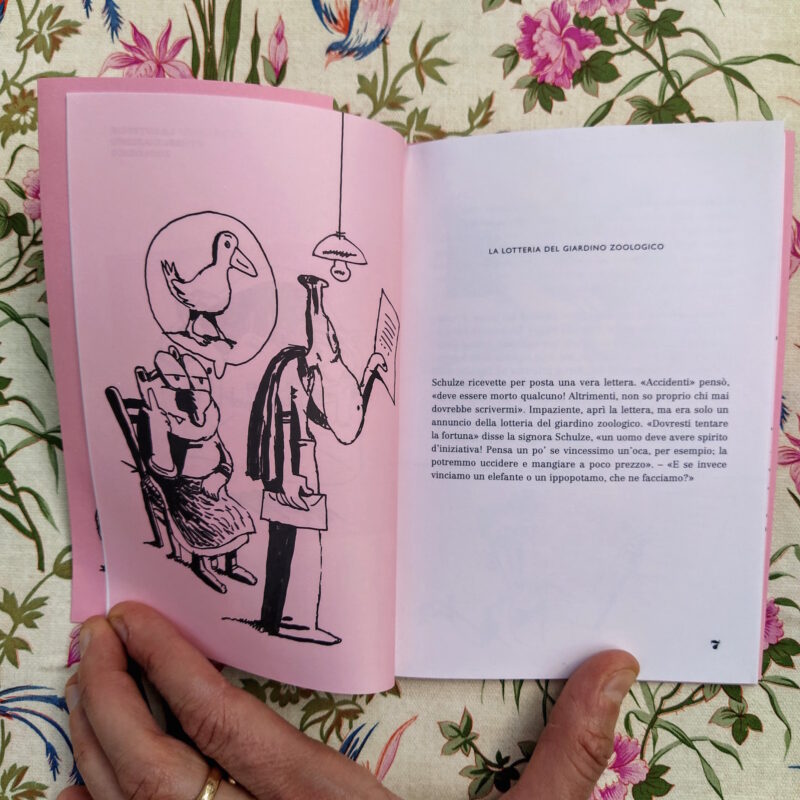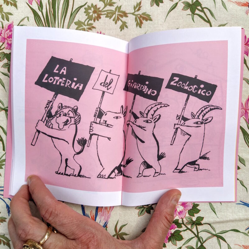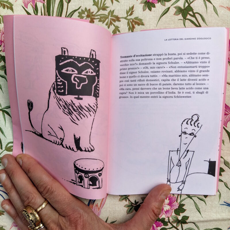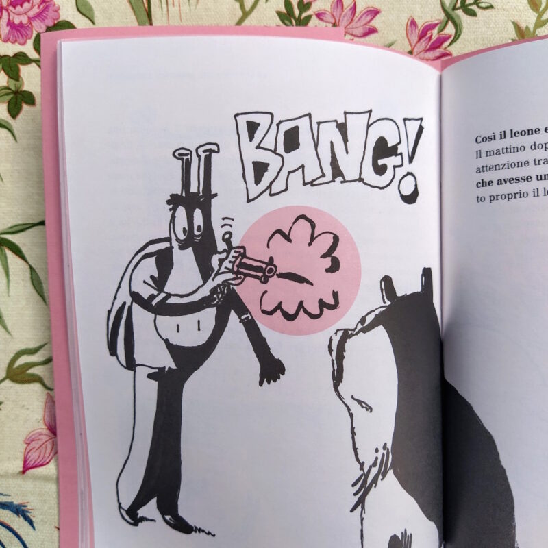 Dolci pagine bianche, rosa e gialle per il noir tragicomico di Kurt Schwitters (1926) illustrato da Alberto Rebori. Cosa succede quando uno zoo si libera dei propri animali con una lotteria e i vicini di un palazzo borghese vincono un leone, un ippopotamo e uno stambecco? Un racconto che smaschera le logiche di potere che gli umani trasferiscono sugli animali per riequilibrare le dinamiche di relazione tra tutti gli esseri viventi.