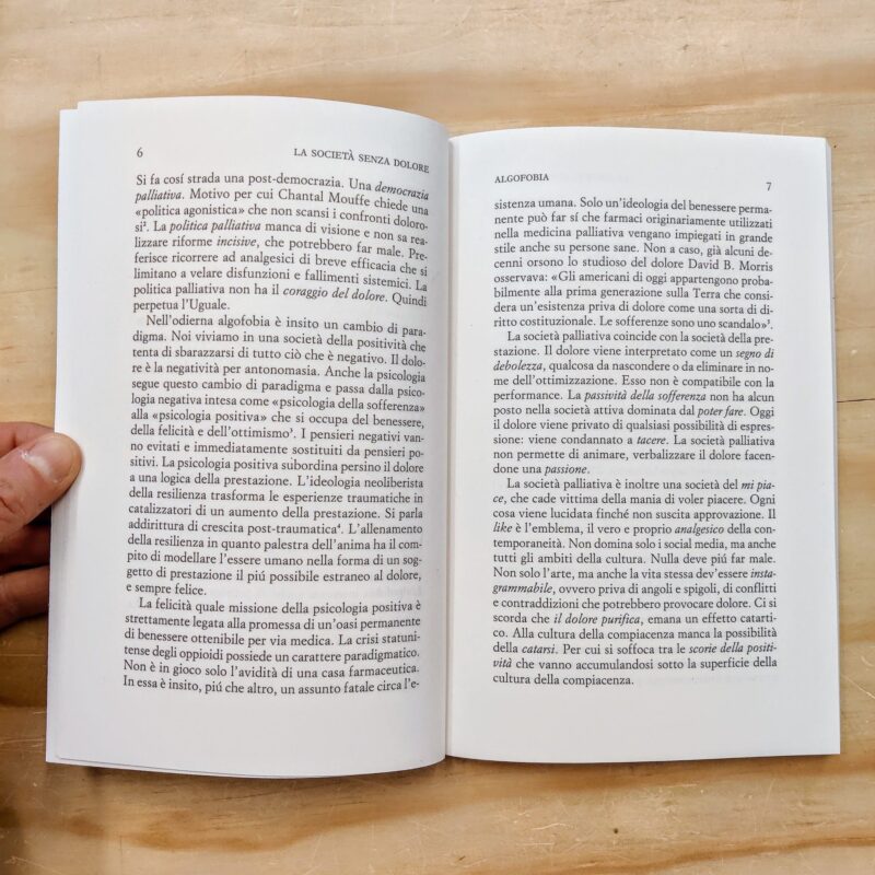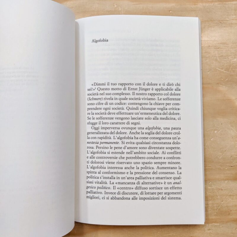 “Oggi imperversa una algoofobia”, una paura generalizzata del dolore. Anche la soglia del dolore crolla con rapidità. L’algofobia ha come conseguenza un’anestesia permanente. Si evita qualsiasi circostanza dolorosa. Persino le pene d’amore sono sospette. L’algofobia si estende nell’ambito sociale. Ai conflitti e alle controversie che potrebbero condurre a confronti dolorosi viene riservato uno spazio sempre minore L’algofobia interessa anche la politica. Aumentano la spinta al conformismo e la pressione del consenso. (..) La mancanza di alternative è un analgesico politico. (..) Invece di discutere. di lottare per argomenti migliori, ci si abbandona alle imposizioni del sistema”.