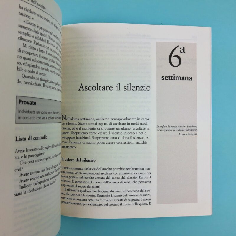 Il vero cambiamento parte da un’azione tanto semplice quanto sottovalutata: ascoltare. Nella cultura del trambusto e del suono costante, ricordarsi di sentire è una sfida che, se vinta, offre inestimabili ricompense: più impariamo ad ascoltare, più la nostra attenzione aumenta, più il nostro lato intuitivo si potenzia, più la chiarezza si fa largo nel caos della nostra mente. L’ascolto può creare connessioni e accendere una creatività profonda, che si declina in ogni aspetto della nostra vita. Julia Cameron ci illustra un programma articolato su sei settimane durante le quali ci prenderà per mano e, con tecniche semplici ed esercizi pratici, ci guiderà in un viaggio di profonda, totale trasformazione. A partire dall’ascolto dell’ambiente che ci circonda, delle persone che ci sono vicine, arriveremo a sentire il silenzio e noi stessi, i nostri veri desideri, e impareremo ad assecondare quelle inclinazioni che ci rendono unici.