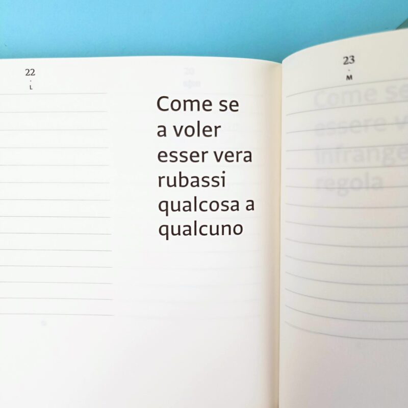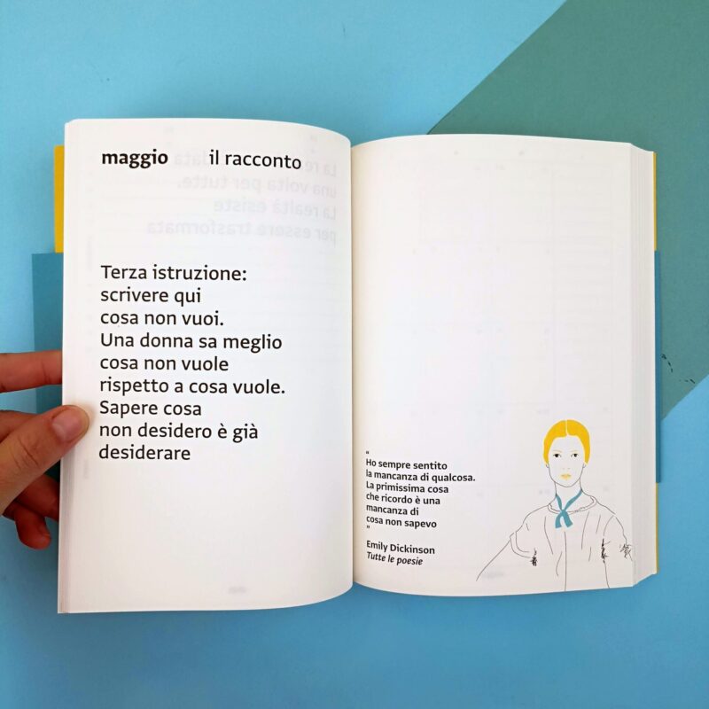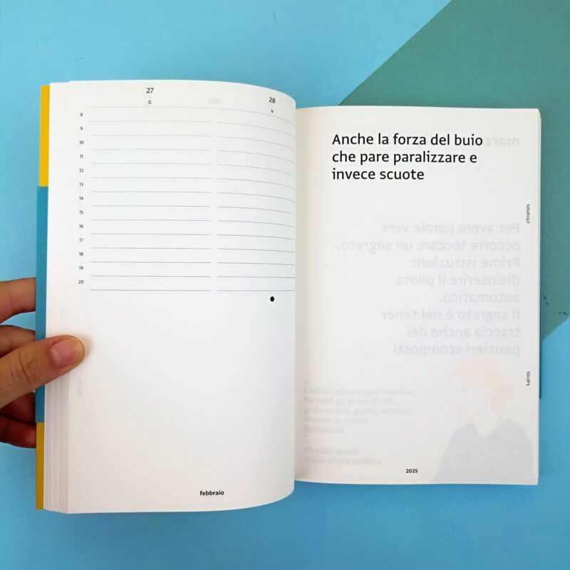 Ogni anno rinasce l’agenda che ne diffonde lo sguardo, attraversando le voci della letteratura per riscrivere giorno per giorno la propria storia.  L’agenda ha un tempo rotto, spazi bianchi improvvisi tra un giorno e l’altro. Esattamente come la vita. Ogni giornata ha uno spazio per segnare appuntamenti col mondo e un’altra per segnare gli appuntamenti con sé.