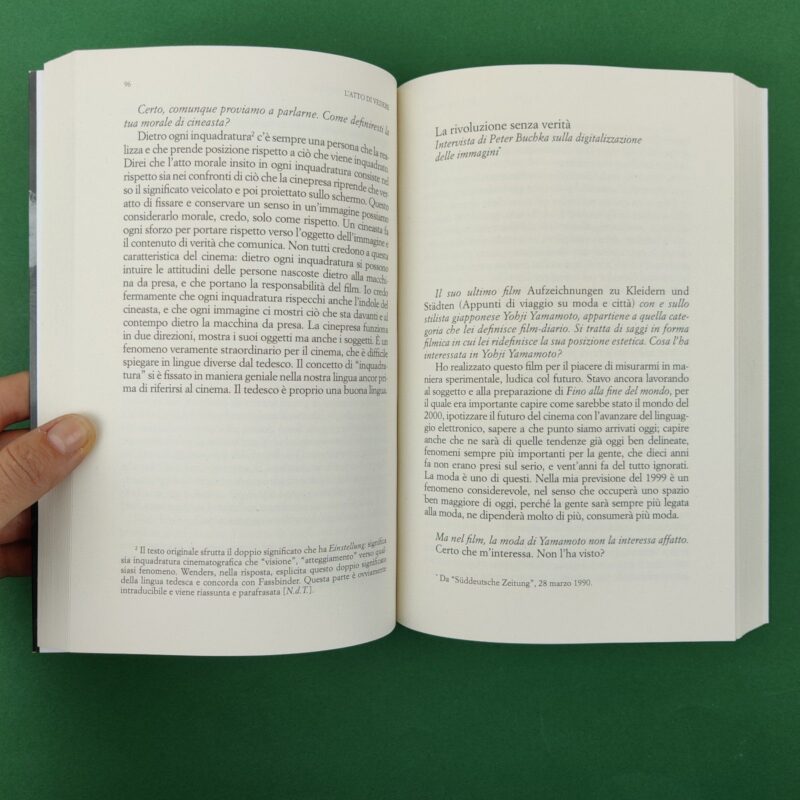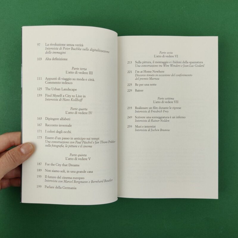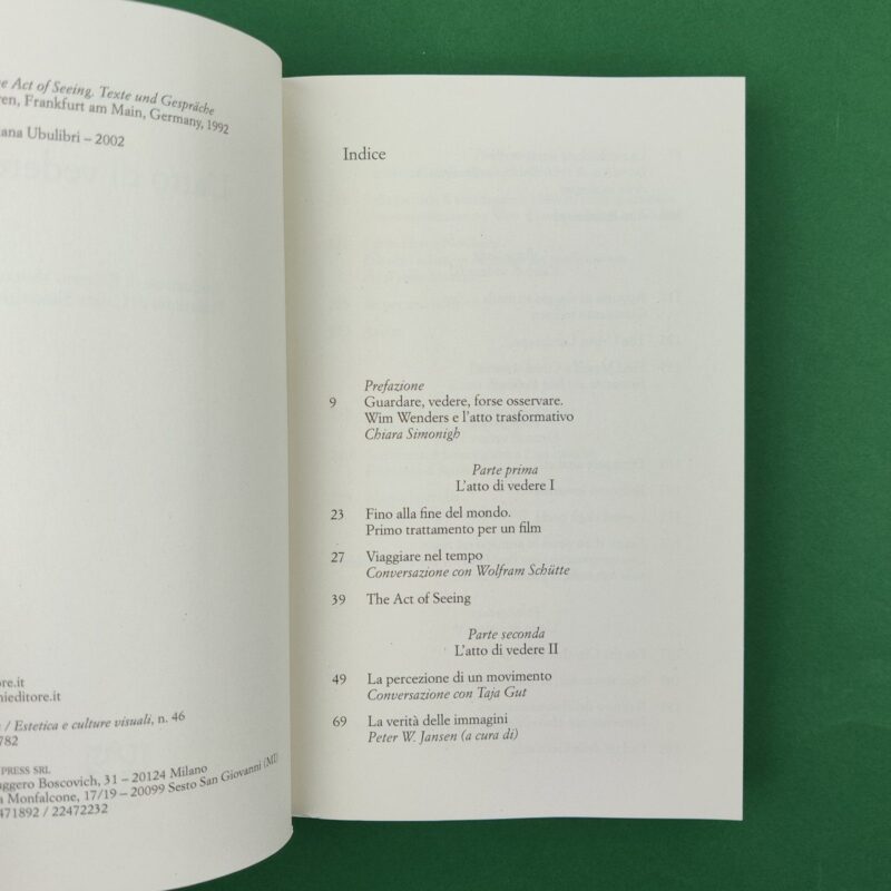 “Credo che l’idea di un film debba nascere da un sogno, da un sogno vero e proprio, oppure da un sogno a occhi aperti”. Bastano poche parole per cogliere l’affascinante personalità di Wim Wenders. Autore introspettivo e sensibile, si batte per una “moralità delle immagini” fatta di rispetto per le persone, i luoghi e la storia. Dopo la Road Trilogy – serie cinematografica ambientata per le strade della Germania occidentale -, Wenders emigra negli Stati Uniti, attirato dalla loro cultura visiva, ma prende presto le distanze dal cinema americano per tornare alle proprie radici, dedicandosi alla costruzione di un cinema europeo e alla ricerca di quella dimensione rimossa del “sentirsi tedesco”. L’atto di vedere raccoglie gli interventi e le interviste del regista dal 1988 al 1992, un periodo di grande creatività e, soprattutto, di riflessione: dalla globalizzazione alla trasformazione digitale del cinema, dall’action film ai nuovi prodotti televisivi, Wenders discute i grandi cambiamenti nel panorama delle immagini in movimento.