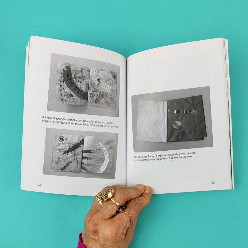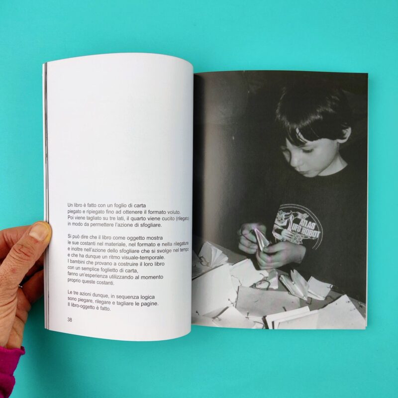 libri con i bambini consiste nel conoscere e usare la regola: “Partire da un solo foglio e porre in sequenza le tre azioni di piegare, rilegare, tagliare le pagine”. Il fare tecnico (l’applicazione della regola) produce l’oggetto libro che impone scelte e idee per contenere storie di segni, con macchie e disegni.