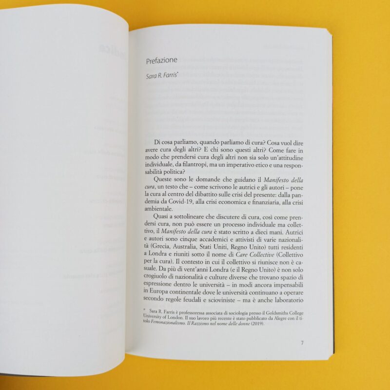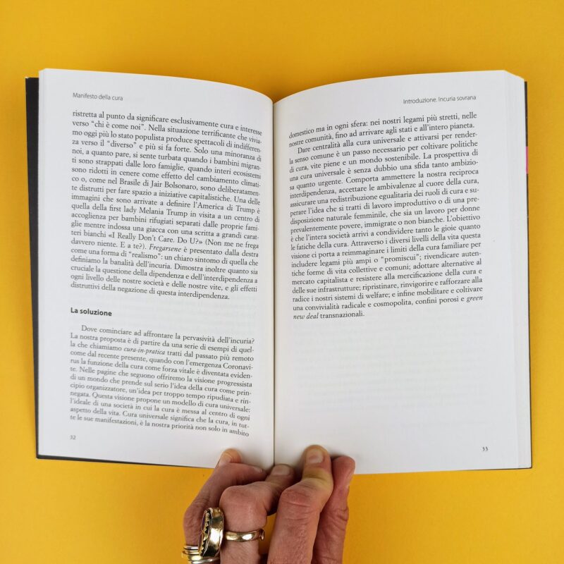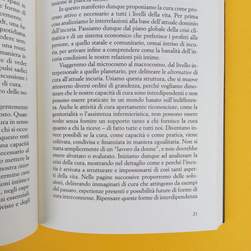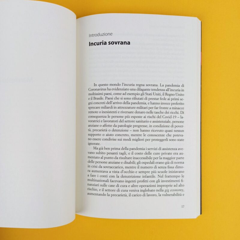 La pandemia ha svelato la centralità sociale dei lavori di cura: badanti, infermiere, lavoratrici domestiche, fattorini, rider e addetti alle pulizie hanno dominato per giorni la scena pubblica. Ma anche se di cura oggi si parla tanto, l’incuria continua a regnare sovrana. Il sistema neoliberista l’ha infatti ridotta a questione individuale, da comprare sul mercato, con una progressiva privatizzazione dei servizi sanitari, sociali e alla persona che privilegia i profitti sulle vite di tutte e tutti noi. Ma se i ricchi possono delegare i propri bisogni quotidiani a soggetti oppressi (donne e migranti) come possiamo dare vita a sistemi in cui l’interdipendenza degli uni dagli altri sia finalmente riconosciuta, in forme solidali e paritarie? Il collettivo inglese Care Collective risponde a questa domanda individuando quattro cardini fondamentali per dare vita a comunità di cura: il mutuo soccorso, lo spazio pubblico, la condivisione di risorse e la democrazia di prossimità. Facendo tesoro delle buone pratiche dei movimenti femministi e ambientalisti propone una cura reciproca, non paternalista né assistenzialista: una «cura promiscua», che non discrimina nessuno ed è fuori dalle logiche di mercato. L’obiettivo è arrivare a un vero e proprio «stato di cura» che non solo crea infrastrutture di welfare «dalla culla alla tomba» ma genera una nuova idea di democrazia orientata ai bisogni collettivi. Dimostrando che la cura è il concetto e la pratica più radicale che abbiamo oggi a disposizione.