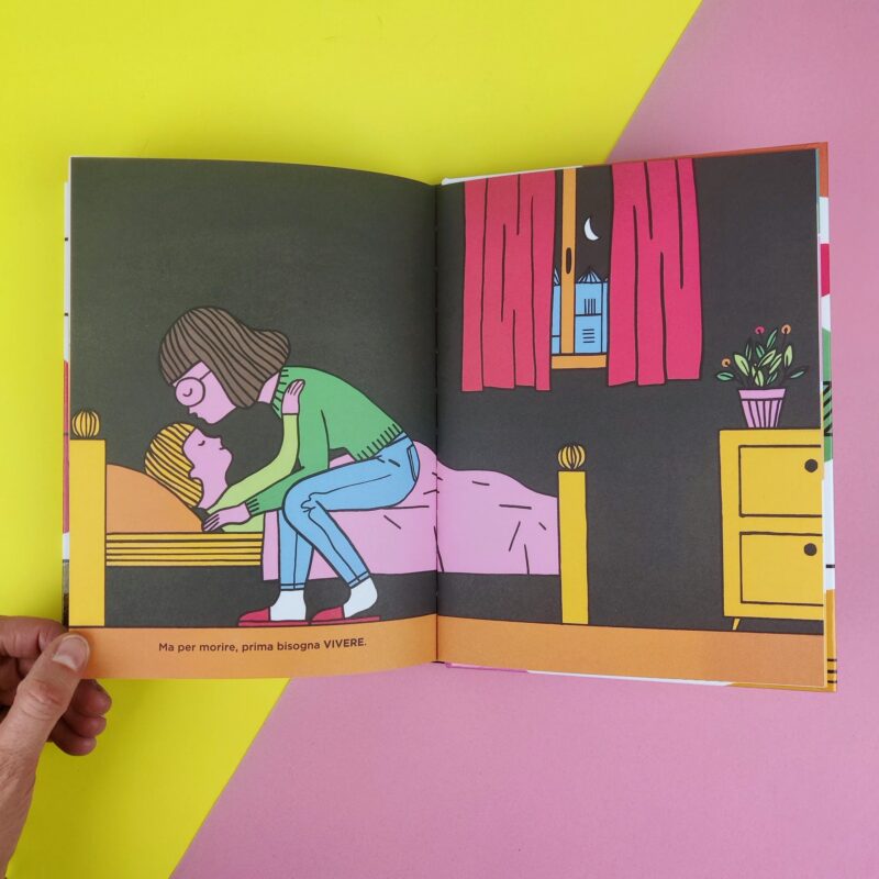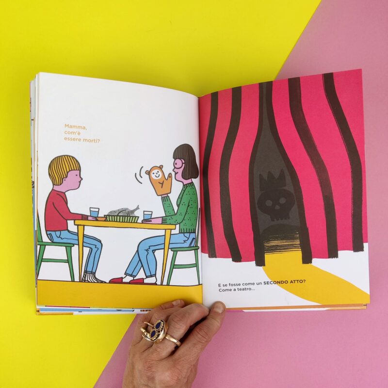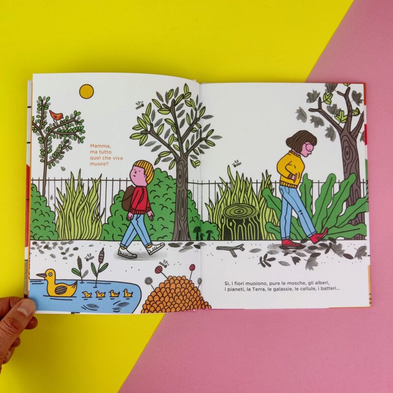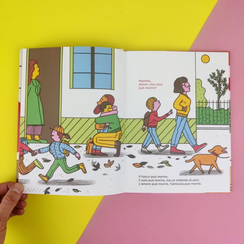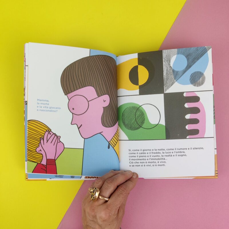 C’è lo stesso sole che vediamo in Una mamma è come una casa, il bambino è cresciuto e si affaccia alle grandi domande: ”Mamma, tutti quelli che vivono muoiono?”. Aurore Petit e Conce Codina giocano a nascondino tra la vita e la morte perché tutto si possa raccontare e condividere, tra luci e ombre.