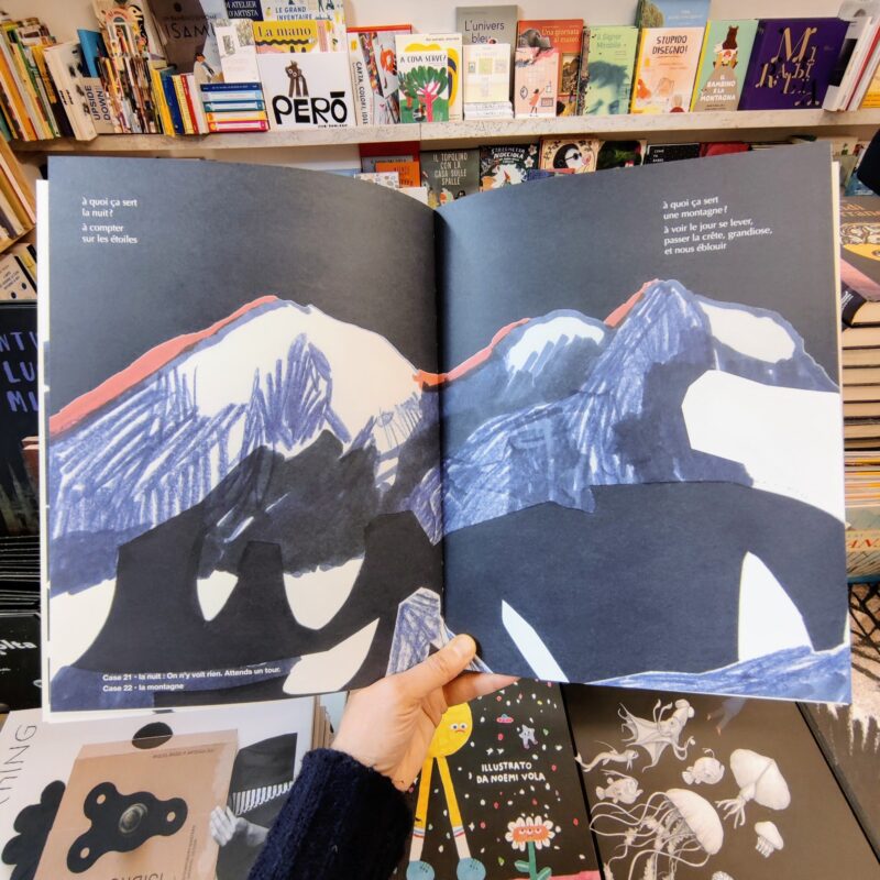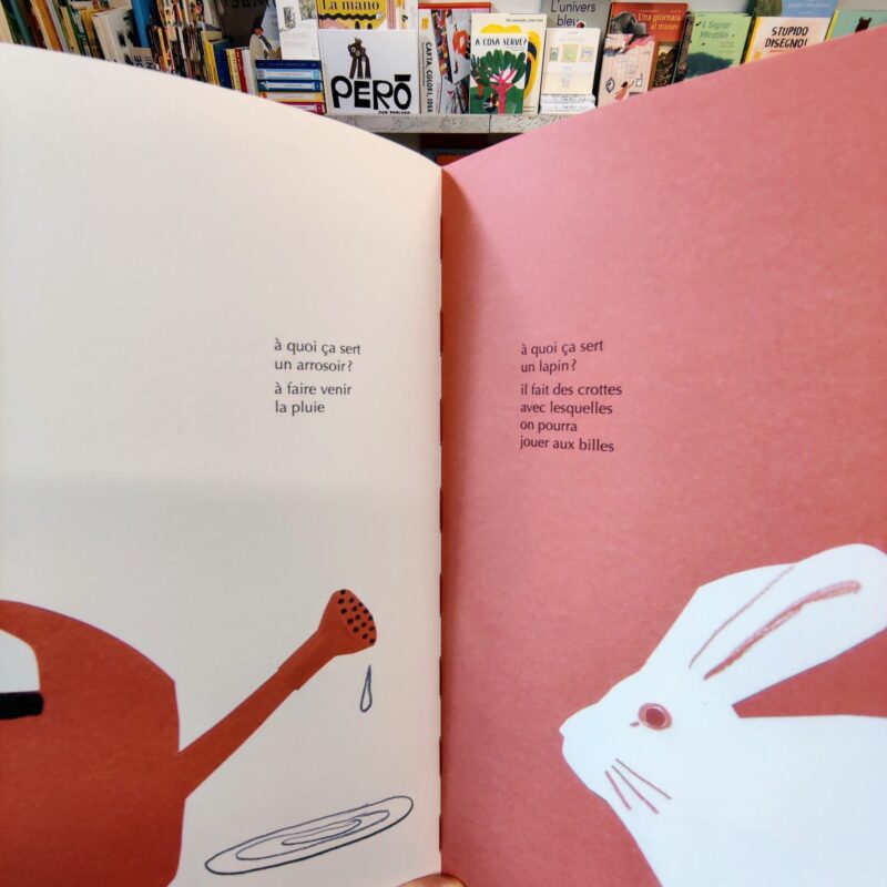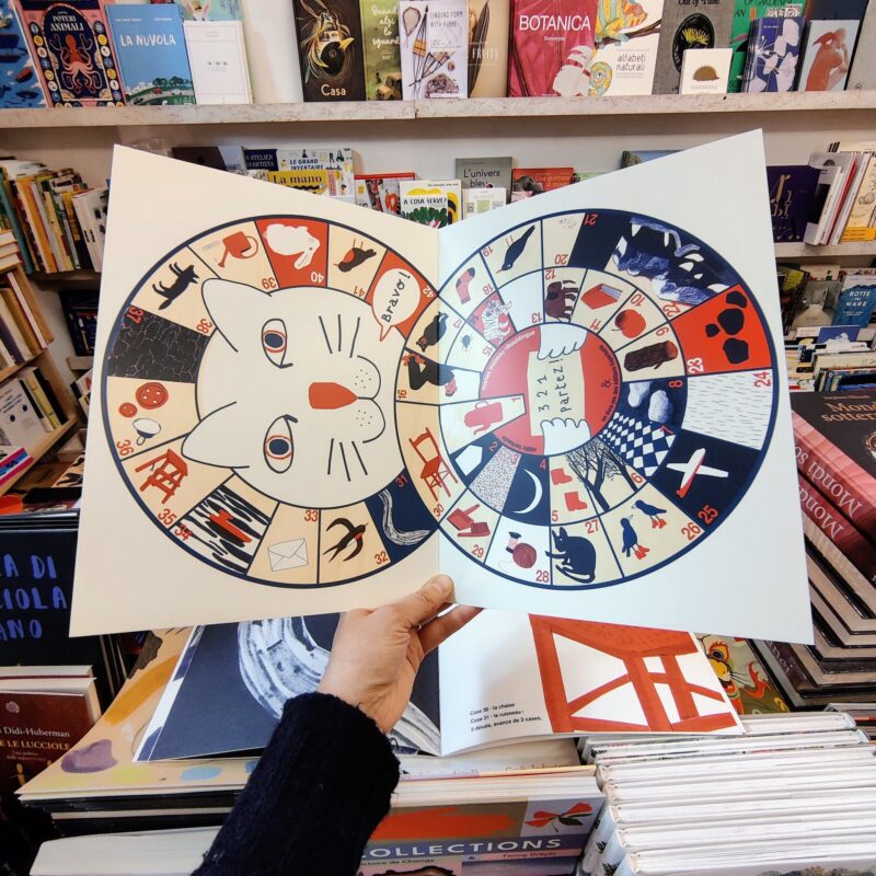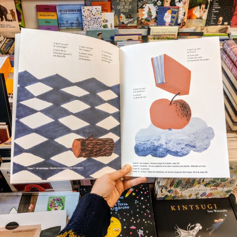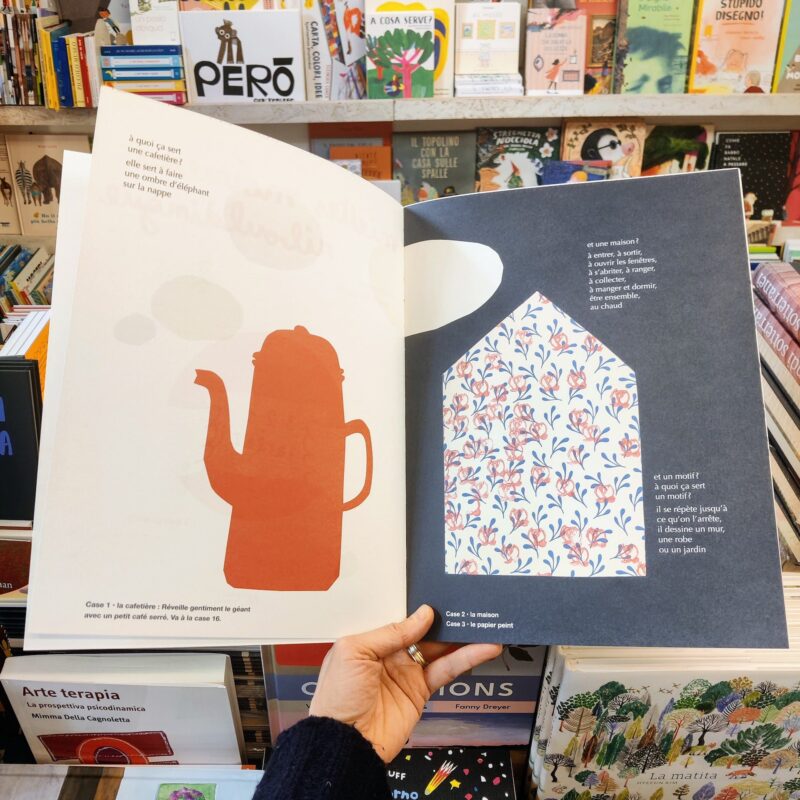Il tabellone di gioco, come il gioco dell’oca, si dispiega e le regole si ritrovano tra le pieghe delle pagine. Mentre leggi, il mondo di Anne Herbauts si dipana tra oggetti, animali e personaggi. Ritroviamo le sue immagini emblematiche: la teiera, il passero, il gigante, le pietre, la carta da parati, la sedia… ulteriormente rafforzate dal gioco di bicromie e da tanti percorsi di riflessione divertenti e insoliti attraverso le piccole frasi ritornelli che scandiscono la scoperta di ogni oggetto e rendono il suo uso poetico.