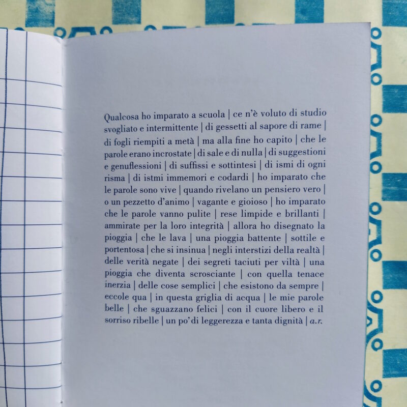 Ci sono case editrici appartate, magiche e misteriose, minuscole e poetiche. Edizioni intime e segrete all’insegna del nom de plume, esercizi di stile e privatissimi divertimenti da condividere con gli amici in tirature fuori commercio. Libri fatti un po’ a naso, autoproduzioni perfette destinate a diventare rarità per bibliofili. Ci sono le Edizioni Fioriblù di Maurizio Minoggio che nel 2014 hanno pubblicato Quadretti, un quaderno spillato di sedici pagine più copertina che è un po’ tutto questo: la spiegazione di come nascano i quaderni a quadretti, una lezione leggera e spensierata di grafica applicata, una poesia visiva, fatta di muta illustrazione soltanto, accompagnata da un breve testo siglato a.r. della sempre più enigmatica Irene Toole.