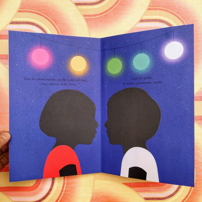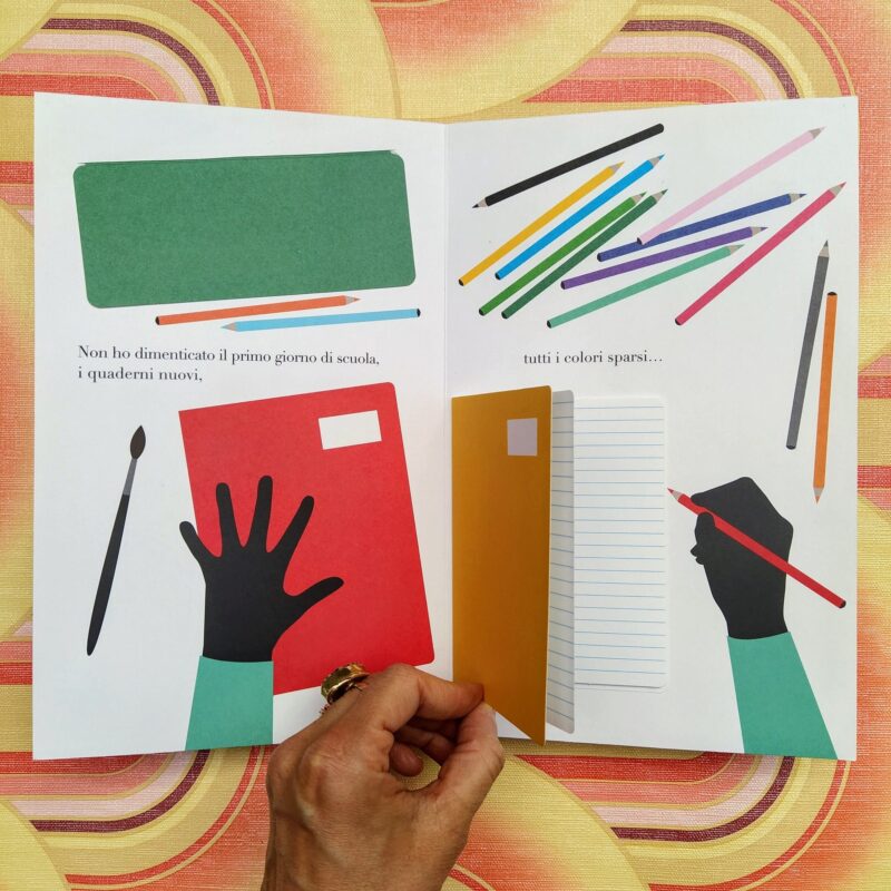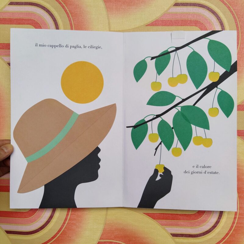 La testa di un cappello di paglia si piega sotto il sole, le ciliegie cambiano colore, il quaderno a righe si apre per il primo giorno di scuola, le bandierine della festa ondeggiano, la serranda della libreria si alza, le facce si avvicinano per un bacio, la mano passa sui ricordi dell’infanzia. Un libro gioco per adulti che desiderano regalare un mazzo di ricordi al posto dei fiori.