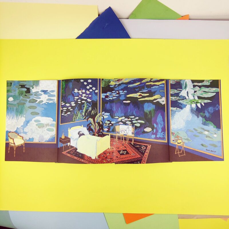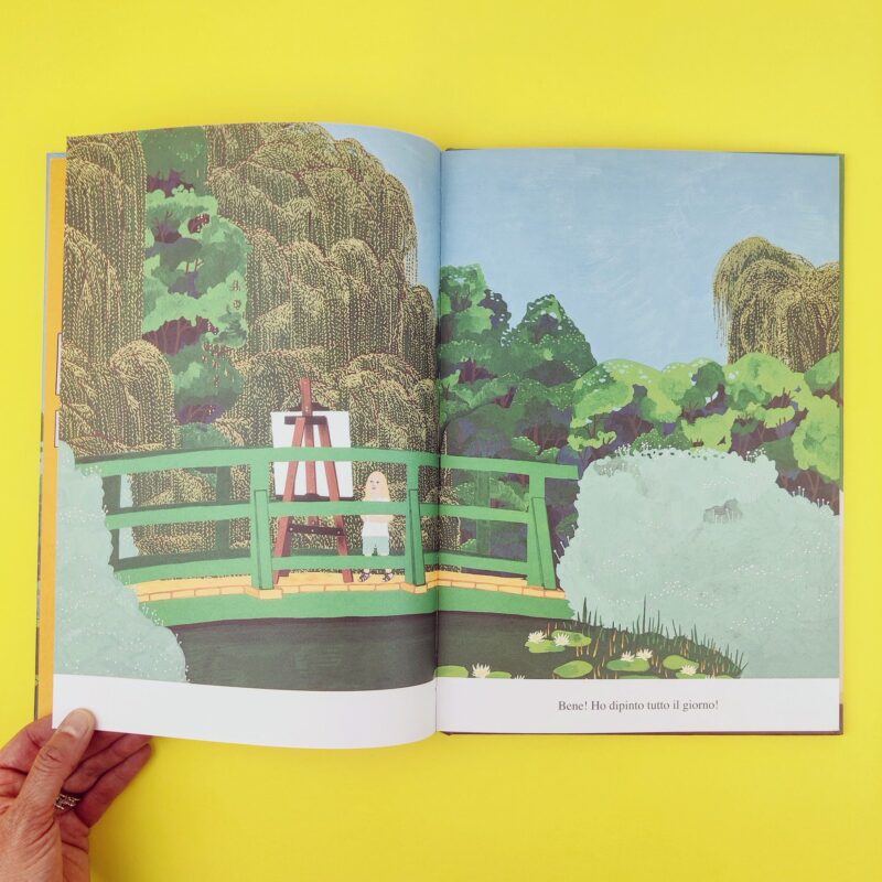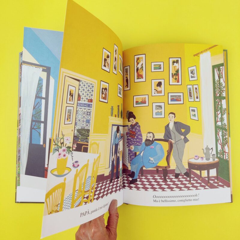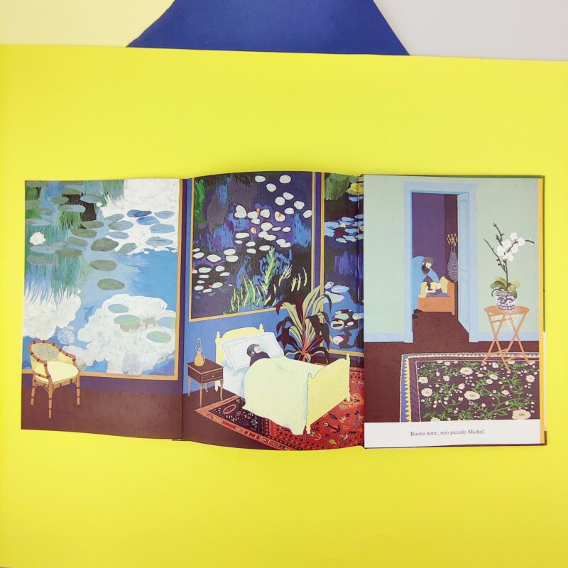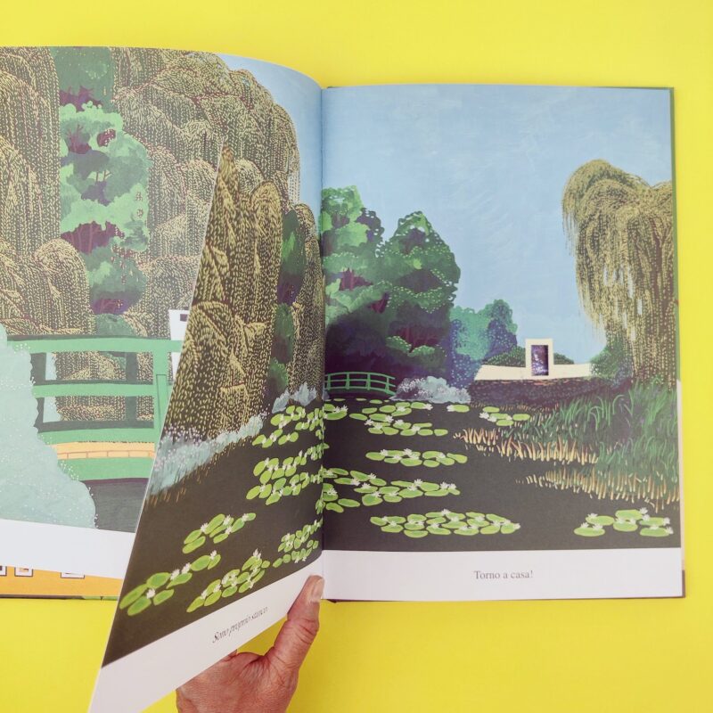 Immerso nella natura e circondato dai quadri del padre, il suo sguardo si allarga alla vastità e inizia a raccogliere il mondo con il disegno. L’albo di grande formato con pagine fustellate e ottavi a finestra seguono questa ampiezza di visione, di giorno e di notte.