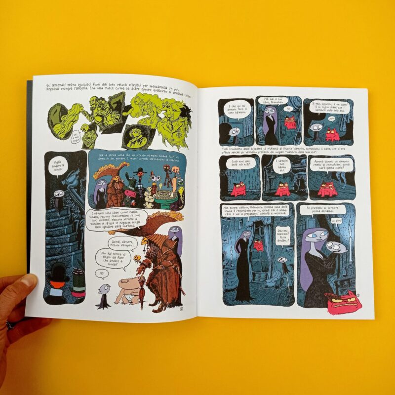 un tempo alla guida dell'Olandese Volante, un cane tutto rosso che non a caso si chiama Pomodoro, Margherita, un tontolone amante della cacca, Oftalmo, il mostro con tre occhi, Claudio, una specie di uomo-coccodrillo che va in monopattino... Una brigata di strane creature che, più che paura, mettono buon umore. È vero, di tanto in tanto i mostri cedono alla vecchia abitudine di mangiare le persone, volano battute un po' macabre e minacce scherzose che lì per lì vengono prese sul serio... Ma Piccolo Vampiro e i suoi mostruosi amici sono sempre pronti ad aiutarsi a vicenda e a escogitare impensabili strategie in vista di obiettivi comuni. Ad esempio, permettere a Piccolo Vampiro di andare a scuola come gli altri bambini anche se non può uscire di giorno, o aiutare Michele, il suo migliore amico, a prendersi una rivincita contro un bullo, o ancora salvare tre cani fuggiti da un laboratorio dove vengono usati come cavie per sperimentare rossetti e dentifrici. Solo che questi generosi personaggi sono un tantino maldestri e tendono a innescare catene di rocambolesche (dis)avventure che tengono i lettori col fiato sospeso e il sorriso sulle labbra. Il volume comprende tre storie spassose: «Piccolo Vampiro va a scuola», «Piccolo Vampiro fa Kung Fu», «La società per la Protezione dei Cani». Attingendo alle storie ebraiche che un tempo gli raccontava sua nonna, Sfar riesce a costruire un universo pieno di fantasia e tenerezza che farà la felicità di tutti i bambini. E anche degli adulti.