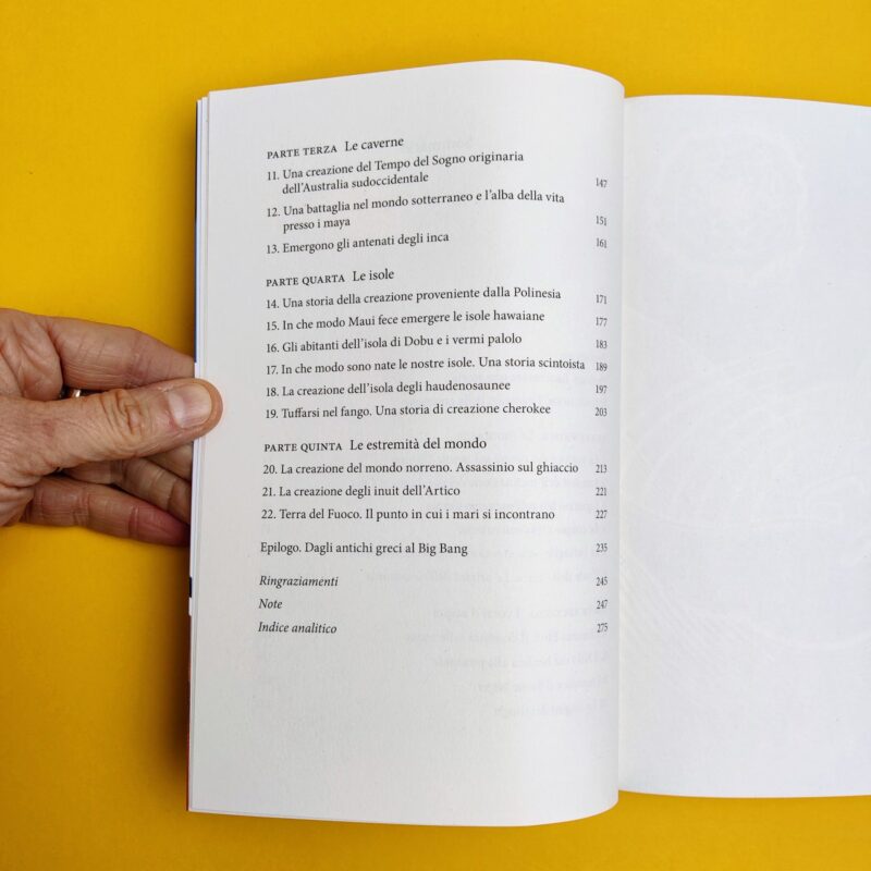 Come nasce il mondo è un segreto, un segreto da tramandare nel tempo. All’origine di tutto era un uovo. Oppure il buio, o un corvo imbroglione, un pescatore di isole, una donna danzante, un concilio di dei intorno a un fuoco sacrificale. Uno stato informe in cui tutto era nel contempo in costante trasformazione e nella più totale assenza di movimento. Poi, d’improvviso, qualcosa si è spezzato: il verbo si è fatto luce, da un albero di mango è sgorgato il mare, un pesce gigante è stato fatto a pezzi e i suoi resti sono stati abitati dagli esseri umani; il cielo è stato strappato dalla terra, e ciò che sarebbe potuto essere è stato diviso per sempre da ciò che è. Anthony Aveni indaga le storie della creazione del cosmo secondo varie culture ed epoche per comprendere che cosa le accomuni e dove la scienza di oggi sfiori la mitologia del passato. Il suo è un viaggio tra montagne magiche e corsi d’acqua sacri, tra profonde caverne buie e isole scese dal cielo, dai maya agli aborigeni, dall’America Latina al Polo Nord, dalla Bibbia al Nihongi: una riflessione sul modo in cui abbiamo provato a spiegarci l’imperscrutabile passaggio dal nulla all’esistenza, e abbiamo trovato risposte nel paesaggio che ci circondava. Come la violenta battaglia tra Marduk e la madre Tiamat raccontata nel babilonese Enuma Elish, che rispecchia le trasformazioni climatiche e geografiche del territorio; o come le distruzioni (e successive rinascite) dell’azteco racconto dei Cinque soli, che mimano i frequenti terremoti e le eruzioni del Popocatépetl. “I racconti della creazione” è un’opera che si muove tra archetipo e fenomeno, tra simbolo e svelamento, tra superstizione e razionalità. Un mosaico di immagini, miti, frammenti e visioni, a ricordarci l’esistenza di una storia, sepolta nei nostri sogni più profondi, che contiene in sé tutto l’esistente; ma che può essere narrata solo attraverso la molteplicità.