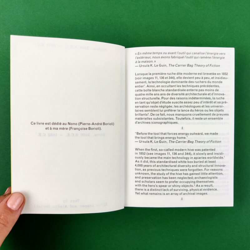 Since the birth of the modern beehive in 1852, structural innovation in hive construction has entered a dormant period. By favouring the standardised box hive, beekeeping turns its back on 4,400 years of architectural diversity. This little book focuses on that period of history prior to homogenisation, drawing from as far back as 2400 BCE. By rejecting a fixed narrative, linearity makes way for polymorphism, introducing graphic design, photography and writing to retell the story of beehives. The 375 images offer a glimpse into this proliferous history of architecture for non-humans. This book is a fragment of an ongoing and open-ended research project titled ?Apian? which uses theoretical, iconographic and ethnographic methods to research on the relationship between bees and humans.