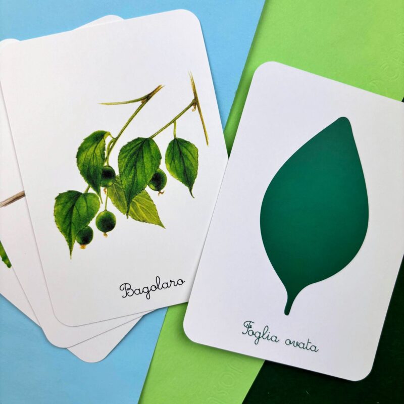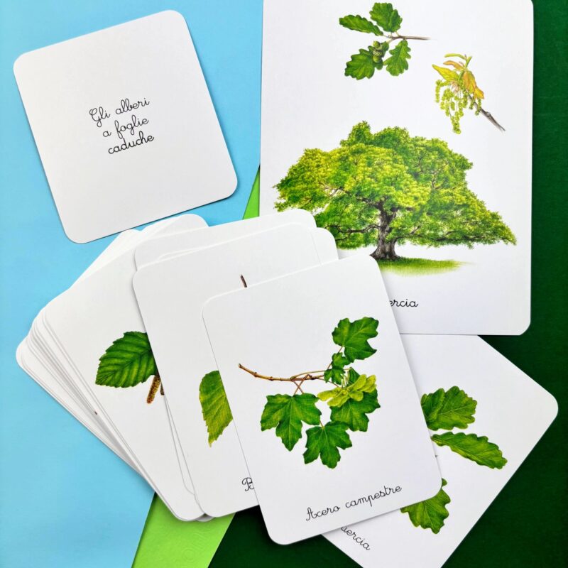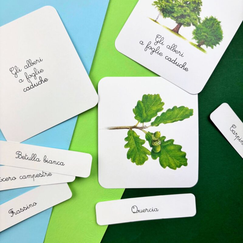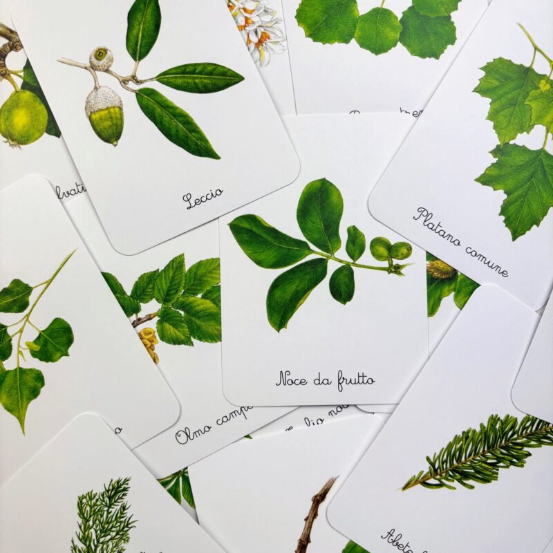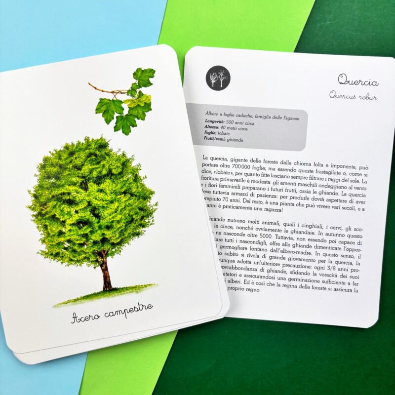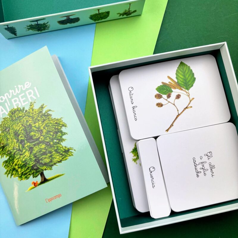 Il cofanetto contiene: • 30 schede descrittive • 30 carte parlate, 30 carte mute e 30 cartellini per riconoscere gli alberi e memorizzarne il nome • 4 carte-categoria (caducifogli e sempreverdi) • 4 tavole anatomiche (l’albero, la foglia, le radici, il tronco) • 1 libretto per svolgere le attività • 1 storia da leggere (La vita dell’albero) • 20 etichette da ritagliare