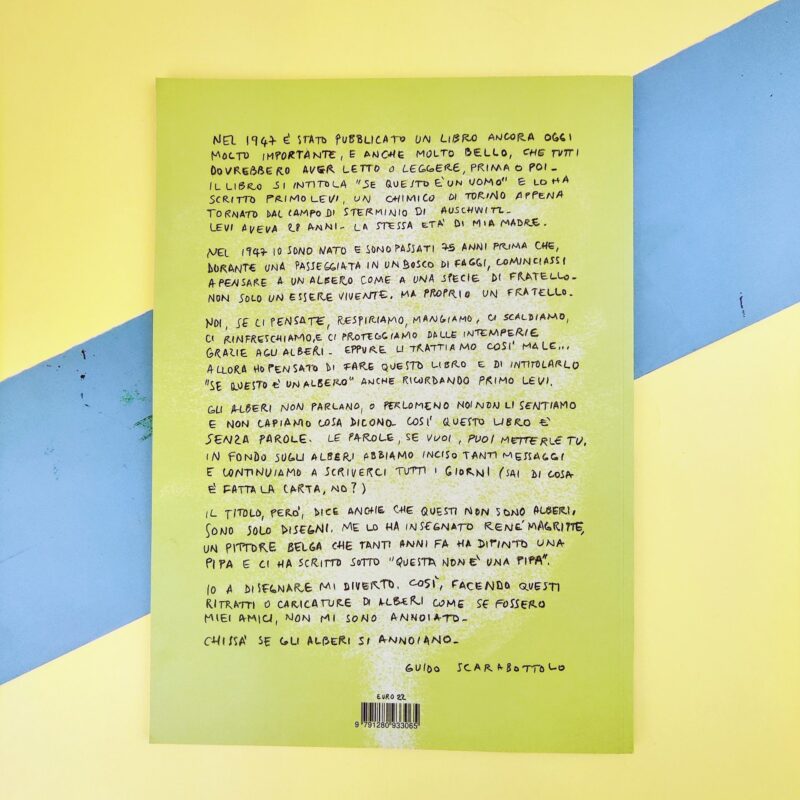 Il libro si intitola "Se questo è un uomo" e lo ha scritto Primo Levi, un chimico di Torino appena tornato dal campo di sterminio di Auschwitz. Levi aveva 28 anni. Nel 1947 io sono nato e sono passati 75 anni prima che, durante una passeggiata in un bosco di faggi, cominciassi a pensare a un albero come a una specie di fratello. Non solo un essere vivente, ma proprio un fratello. Noi, se ci pensate, respiriamo, mangiamo, ci riscaldiamo e ci proteggiamo dalle intemperie grazie agli alberi, eppure li trattiamo così male... Allora ho fatto questo libro e ho pensato di intitolarlo "Se questo è un albero" anche pensando a Primo Levi. Gli alberi non parlano, o perlomeno noi non li sentiamo e non capiamo cosa dicono, così questo libro è senza parole. Le parole, se volete, potete mettercele voi» (Guido Scarabottolo)