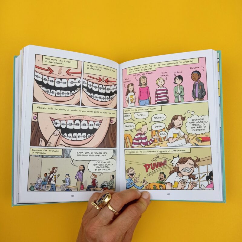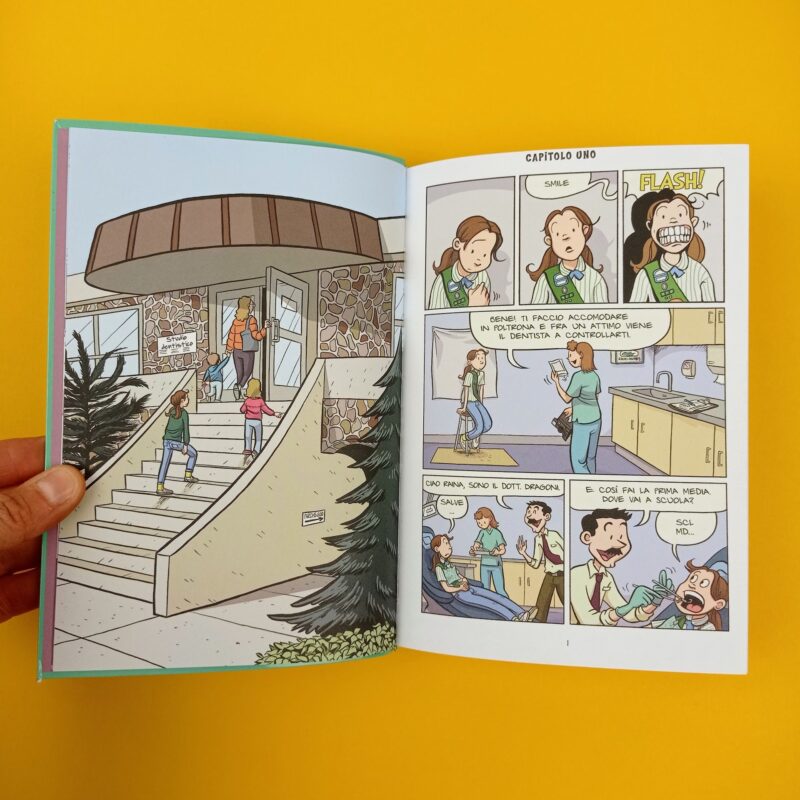 Raina inizia con tranquillità le medie. Ma una sera, mentre torna a casa, succede l’imprevisto: inciampa, cade e si rompe i due denti davanti. Un dramma! Comincia così una lunga serie di sedute dal dentista, operazioni e apparecchi di ogni tipo – denti finti inclusi. La vita però continua, e c’è tanto altro: la scuola, le amiche, i ragazzi, il disegno. Dalla prima media all’inizio della scuola superiore, Raina scopre il suo talento, trova dei veri amici… e torna a sorridere. Con e senza apparecchio!