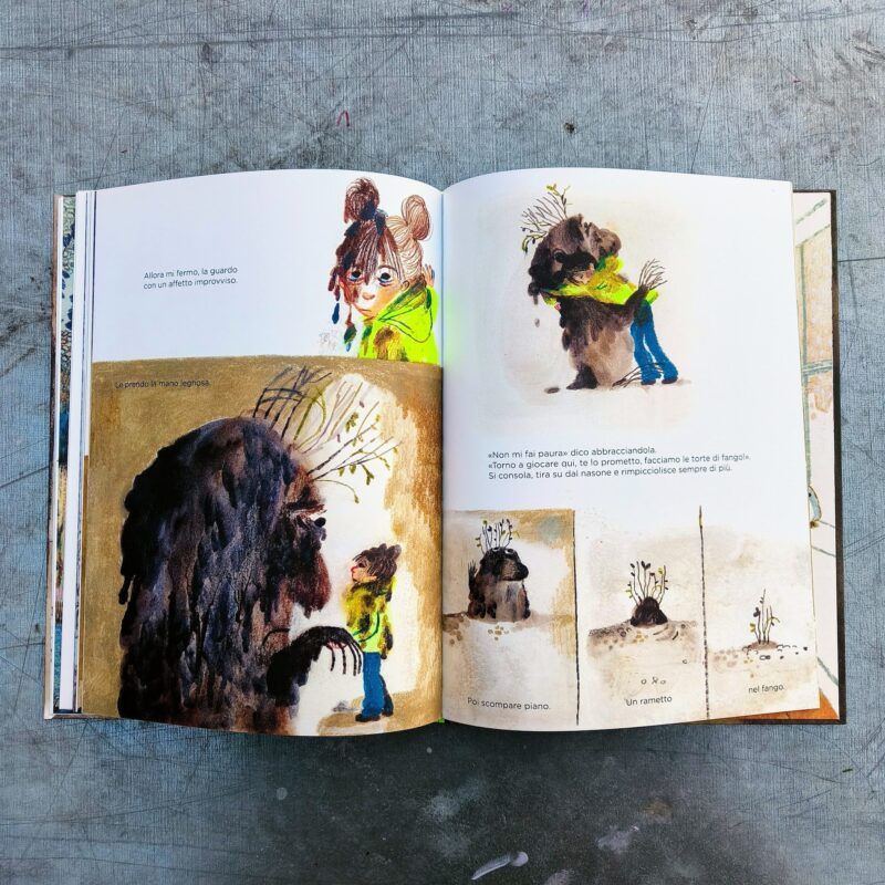 Figlia di Addio Biancaneve, nella pittura libera la rabbia riprende corpo e si sdoppia: umana-bambina alle prese con le difficoltà del mondo e montagna di terra che cresce e svanisce con l’ intensità delle emozioni.