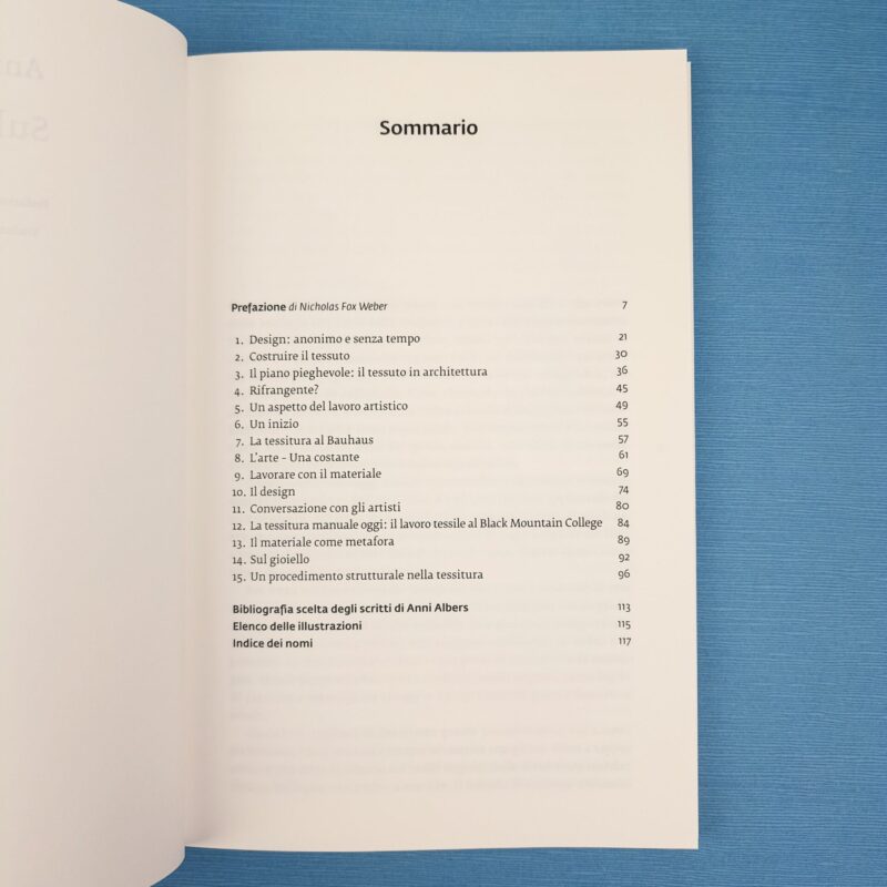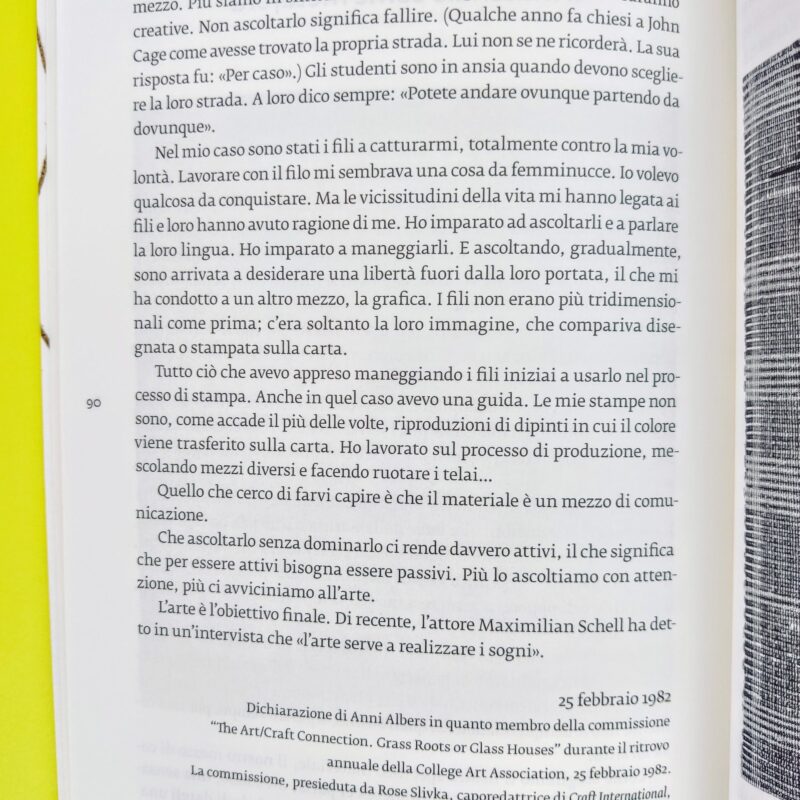 Una raccolta di scritti, sintesi di un pensiero scaturito e maturato nella pratica artistica quotidiana, attraverso cui emerge chiaro lo spirito critico di Anni Albers e la sua capacità di sperimentazione multidisciplinare in ascolto della materia.