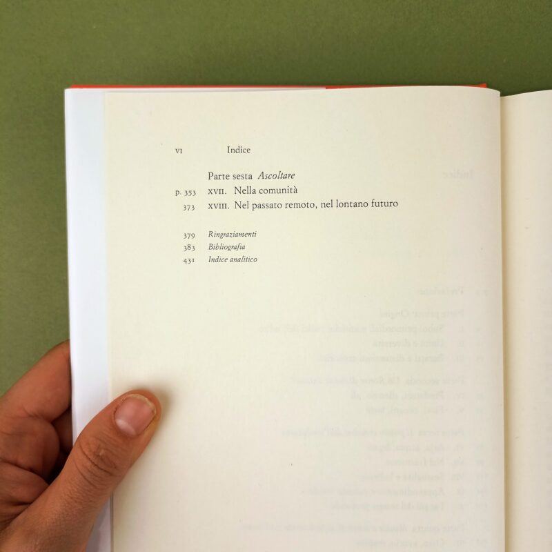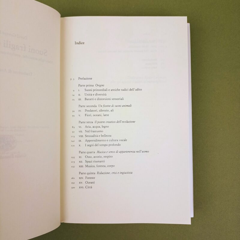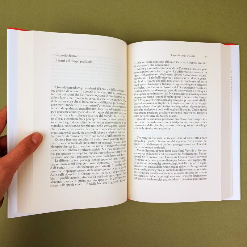 “L’ascolto è la porta di accesso alle meraviglie della comunicazione e della fantasia, e ci insegna che viviamo in un’epoca di decrementi. L’estetica (saper apprezzare e tenere conto delle percezioni sensoriali) dovrebbe essere la guida principale tra gli spasmi dei cambiamenti e delle ingiustizie dilaganti. Invece instauriamo un rapporto sempre meno sensibile e stratificato con la comunità della vita. Questa rottura fa parte della crisi sensoriale: ci estraniamo dalla bellezza e dalla discontinuità del mondo vivente, distruggendo le indispensabili fondamenta sensoriali dell’etica umana. Quella che stiamo attraversando è una crisi non solo ambientale, ma percettiva. Quando la specie più potente della Terra cessa di ascoltare le voci degli altri, il risultato è la catastrofe. La vitalità del mondo dipende, almeno in parte, dalla nostra capacità di sintonizzare nuovamente l’udito sulla vita terrestre”.