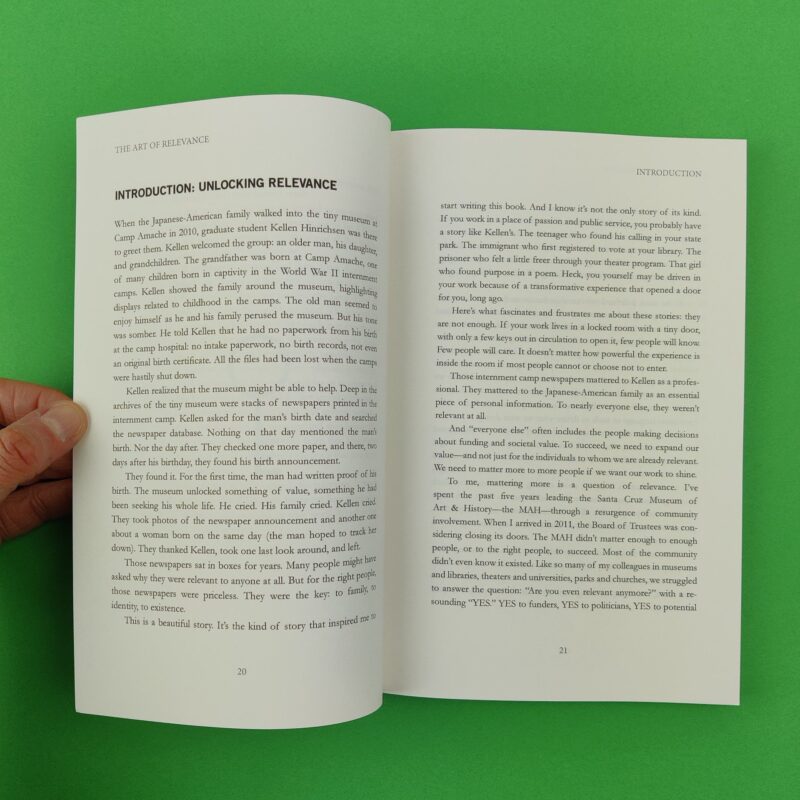 What do the London Science Museum, California Shakespeare Theater, and ShaNaNa have in common? They are all fighting for relevance in an often indifferent world. The Art of Relevance is your guide to mattering more to more people. You’ll find inspiring examples, rags-to-relevance case studies, research-based frameworks, and practical advice on how your work can be more vital to your community. Whether you work in museums or libraries, parks or theaters, churches or afterschool programs, relevance can work for you. Break through shallow connection. Unlock meaning for yourself and others. Find true relevance and shine.