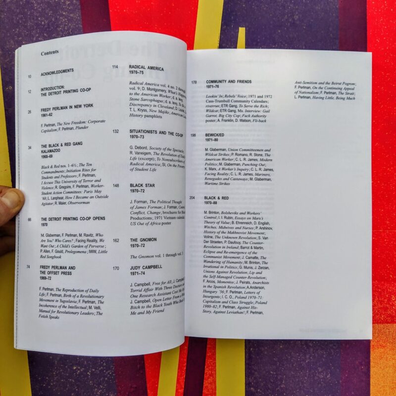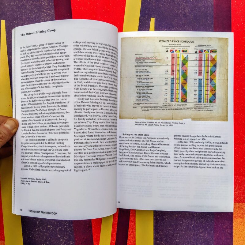 Il testamento della potenza della stampa, dell'autoproduzione, della comunicazione grafica e dell'auto distribuzione: unendo l'analisi dei processi di stampa a quelle delle pubblicazioni create (libri, pamphlet, poster e brochure) insieme alle scelte ideali, la graphic designer Danielle Aubert racconta la storia del collettivo Detroit Printing Co-op, nato da un gruppo di amici attivi nella sinistra radicale che nel 1969 rilevò una storica stamperia della città.