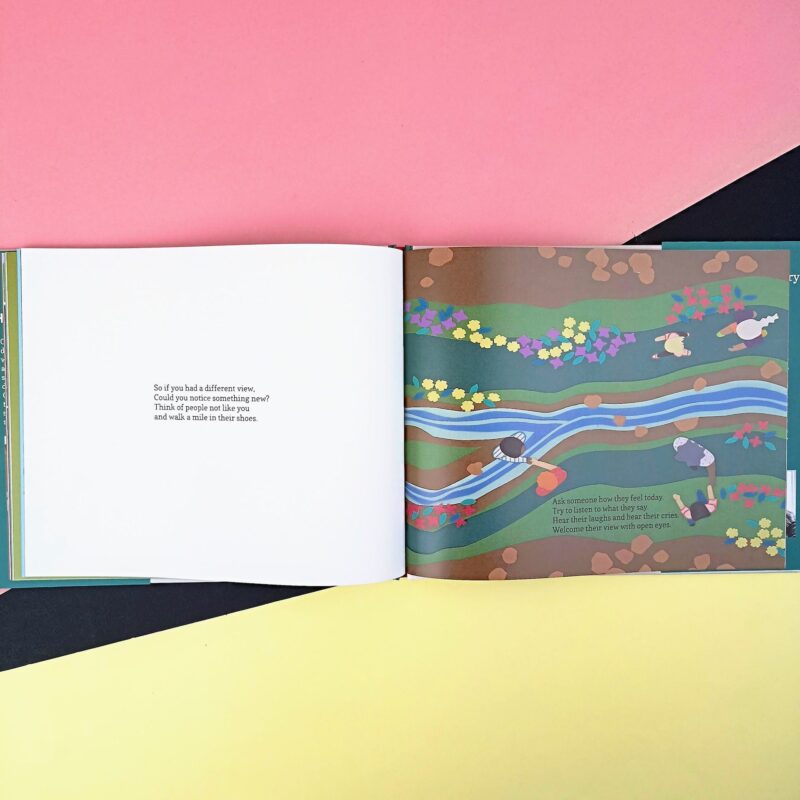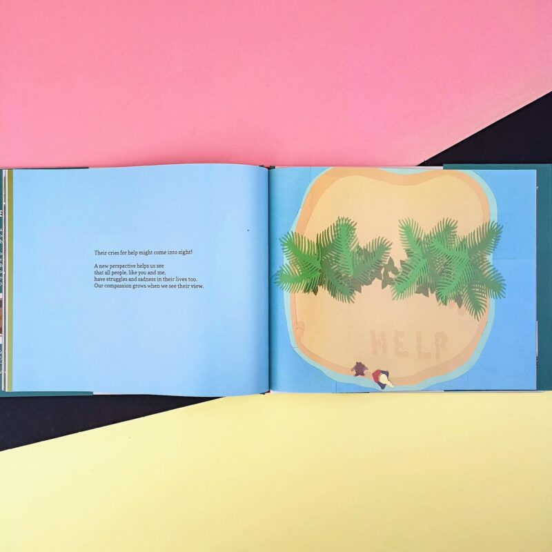 Lo sguardo è una questione di posizione: pagina dopo pagina, sperimentiamo prospettive alternative di visione a seconda di come il nostro corpo guarda alle cose, dall’alto, dal basso, da vicino o da lontano.. per aprire nuove possibilità di interpretazione.