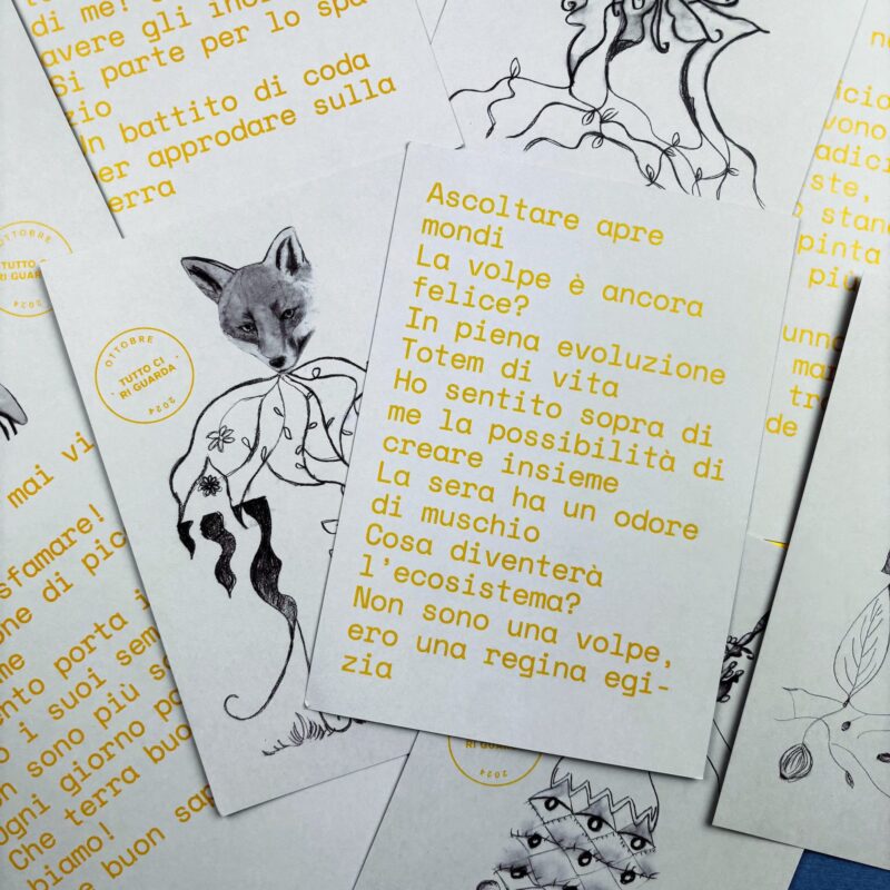Un progetto editoriale, racconto di un lavoro relazionale e collettivo a partire dall’opera dell’artista Guendalina Salini. Una cartella di 10 piccoli manifesti fronte retro con uno in più che traccia spunti di libri letti e ascoltati e un altro ancora per dar vita ad un “vivente pungente” coinvolti in un ambiente sonoro.